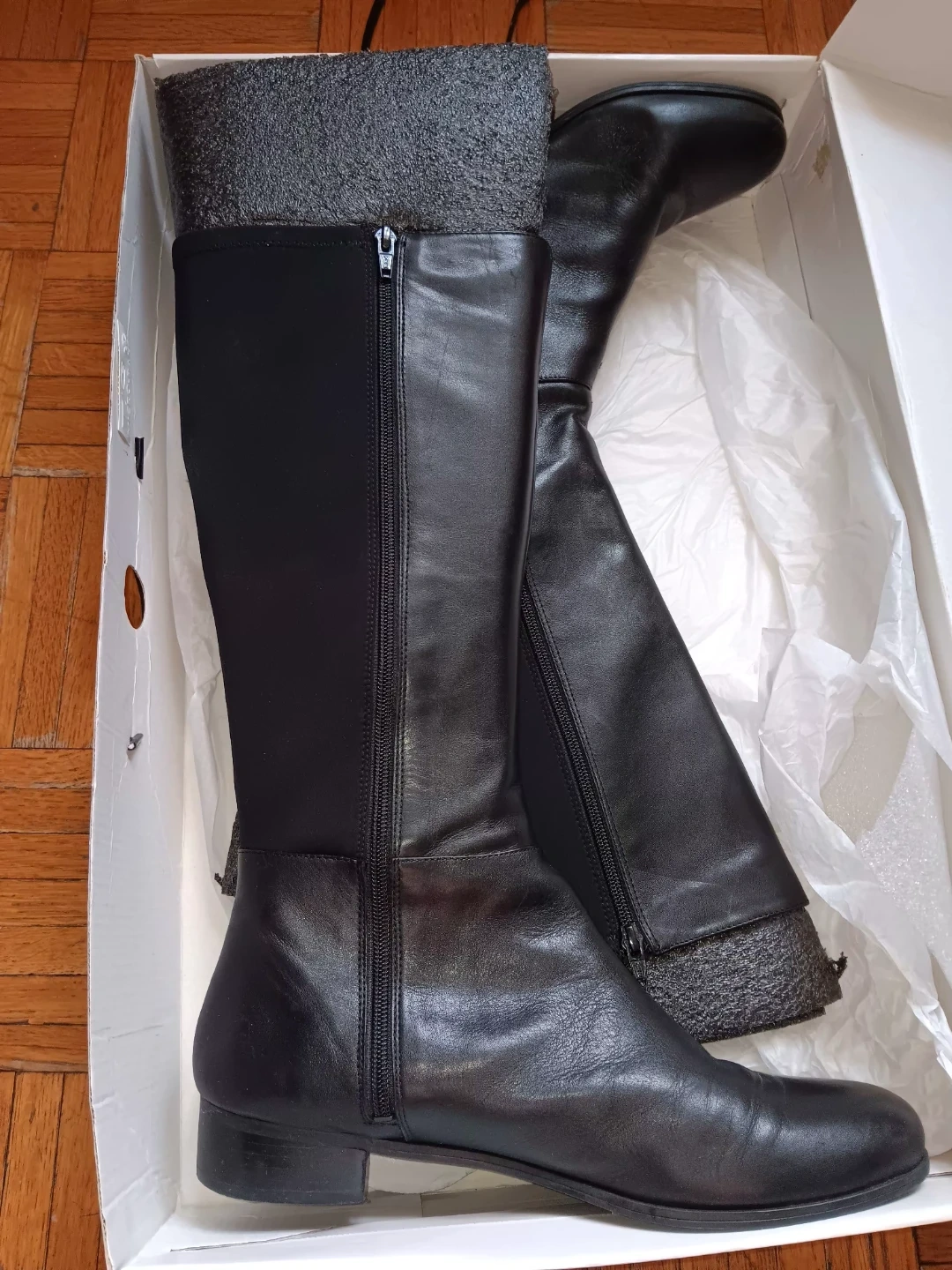 Selling a pair of black leather knee-high boots. They come in their original box. Perfect for fall and winter!