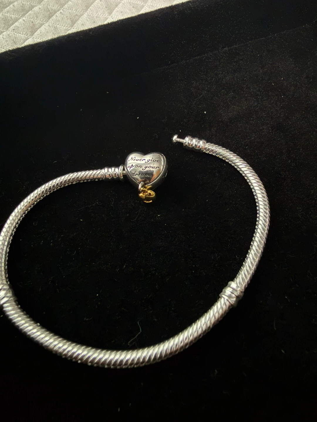 Pandora sterling silver snake chain bracelet with a heart-shaped charm. The charm has "Never give up on your dreams" inscribed on it and a small gold-tone heart dangle. Includes original Pandora box.