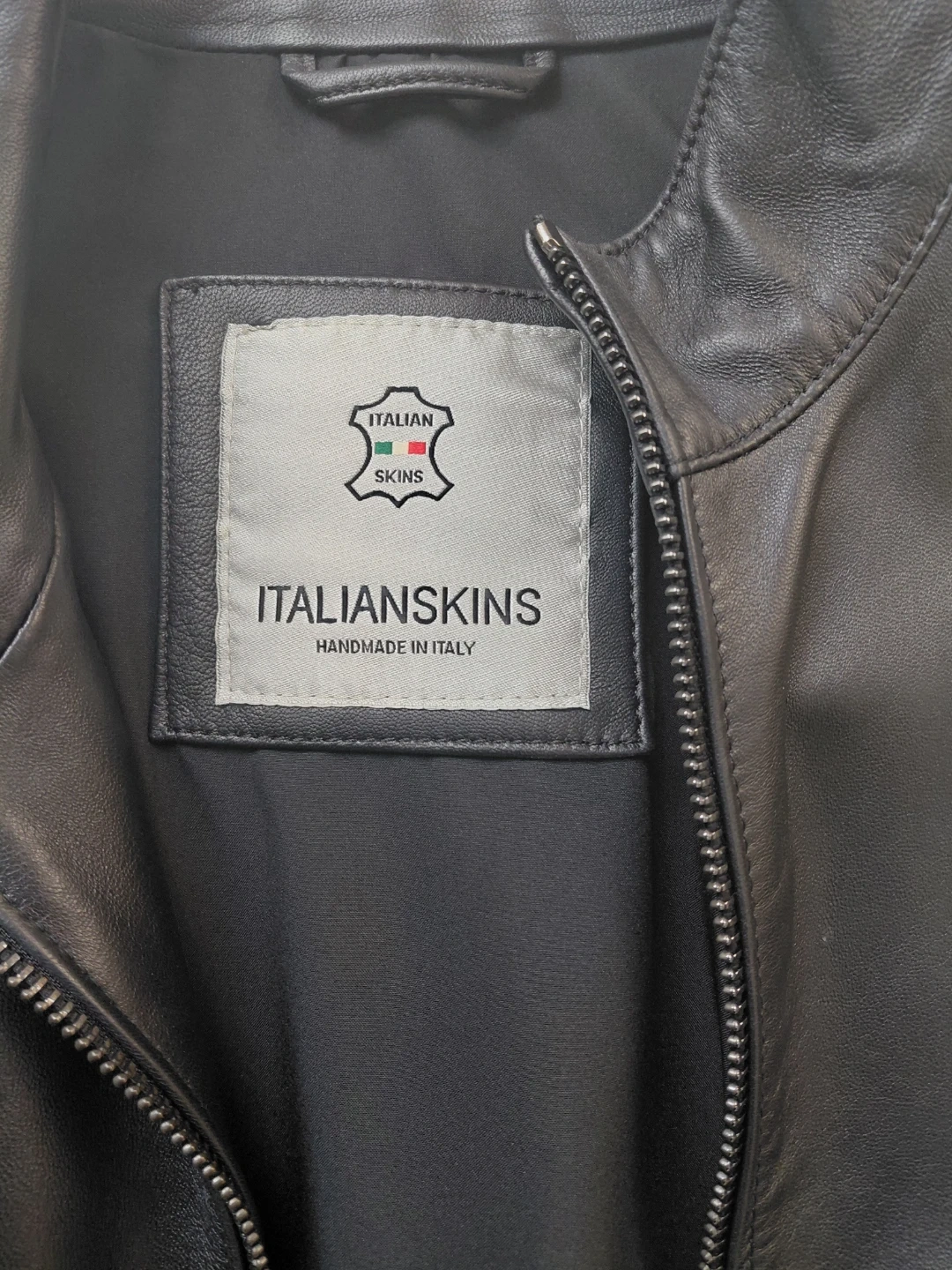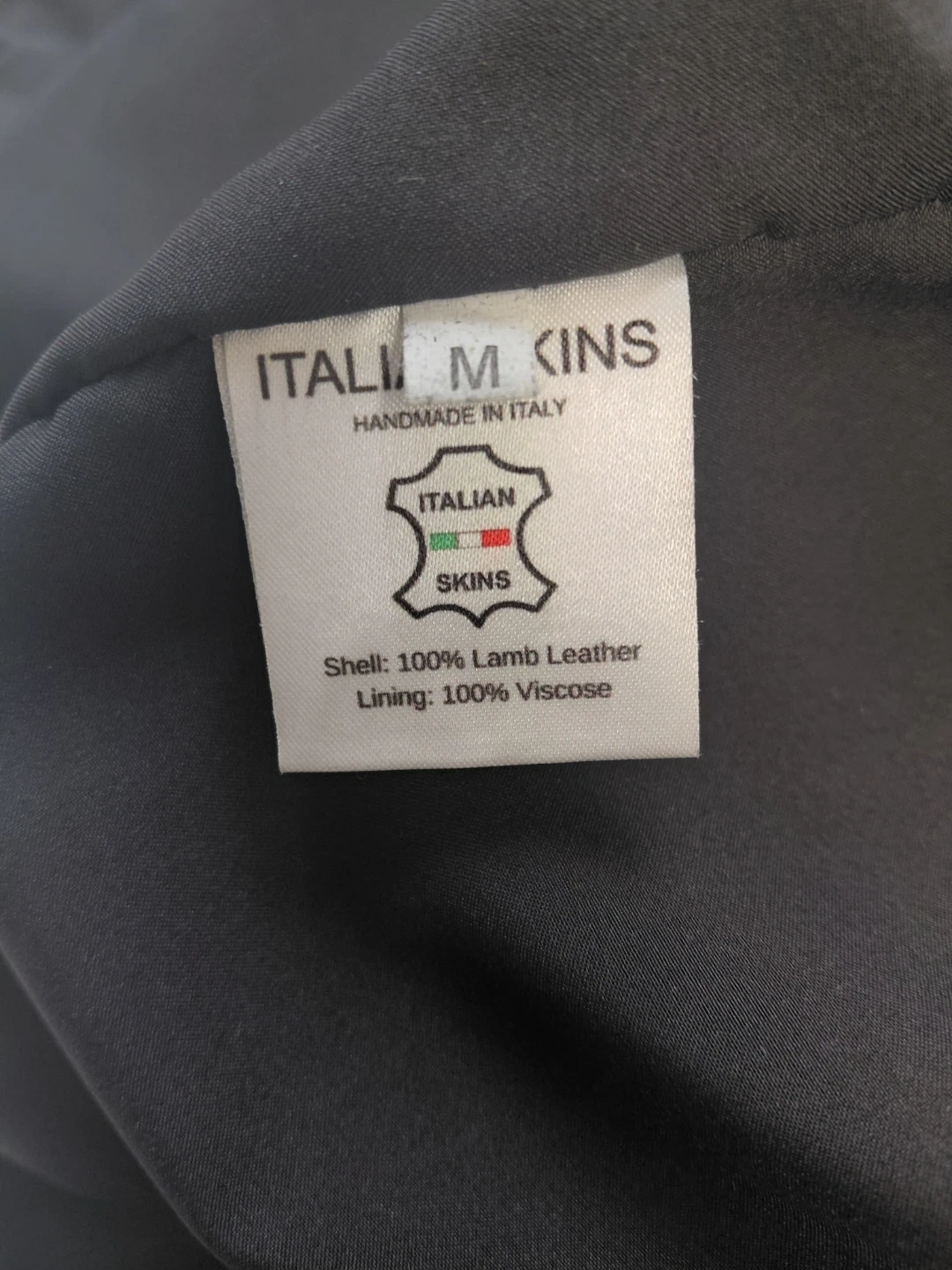 This ITALIANSKINS jacket is handmade in Italy. It features a shell made of 100% lamb leather and a lining of 100% viscose. It's a size medium. This jacket would be useful for a stylish outerwear option.