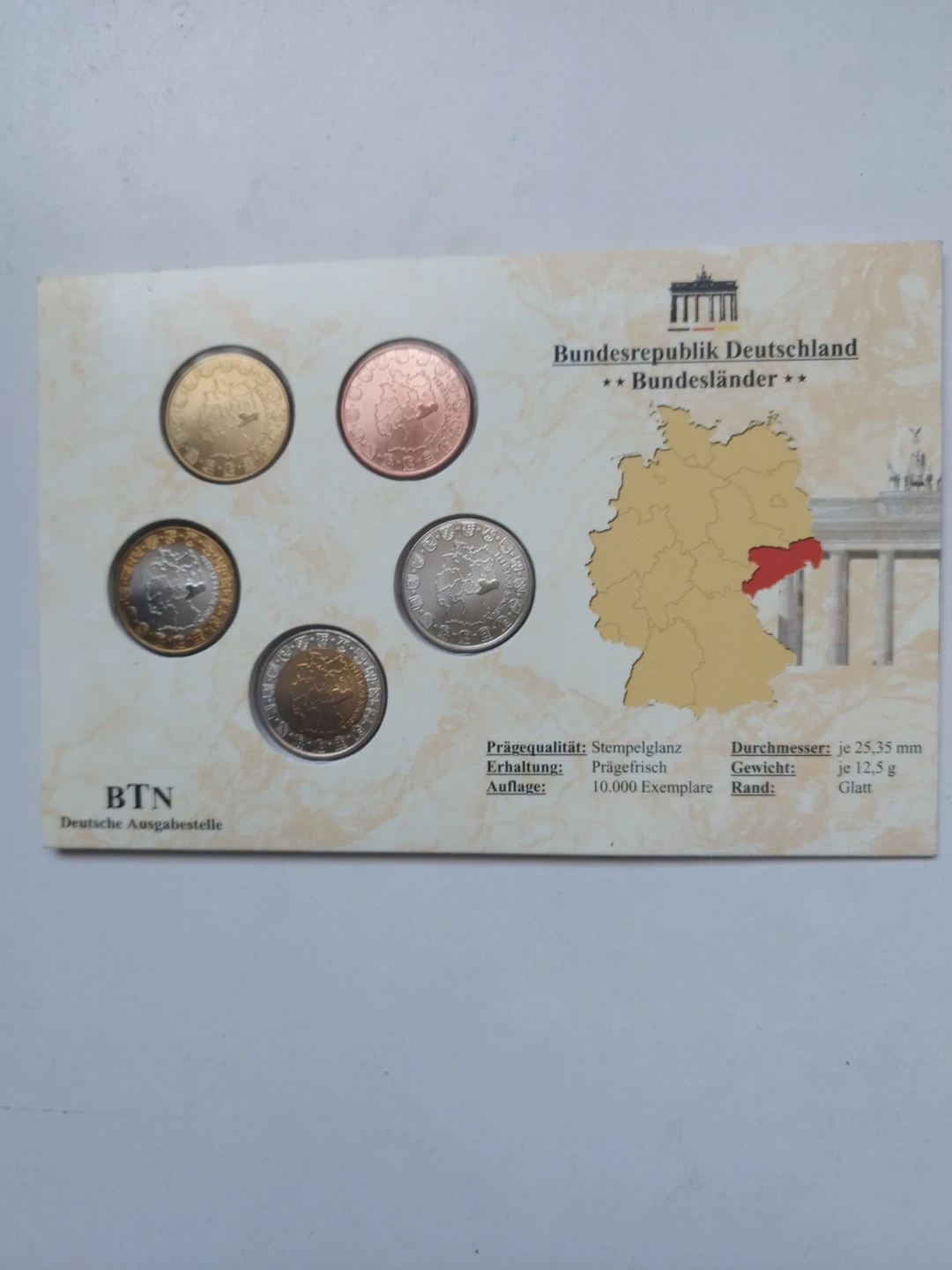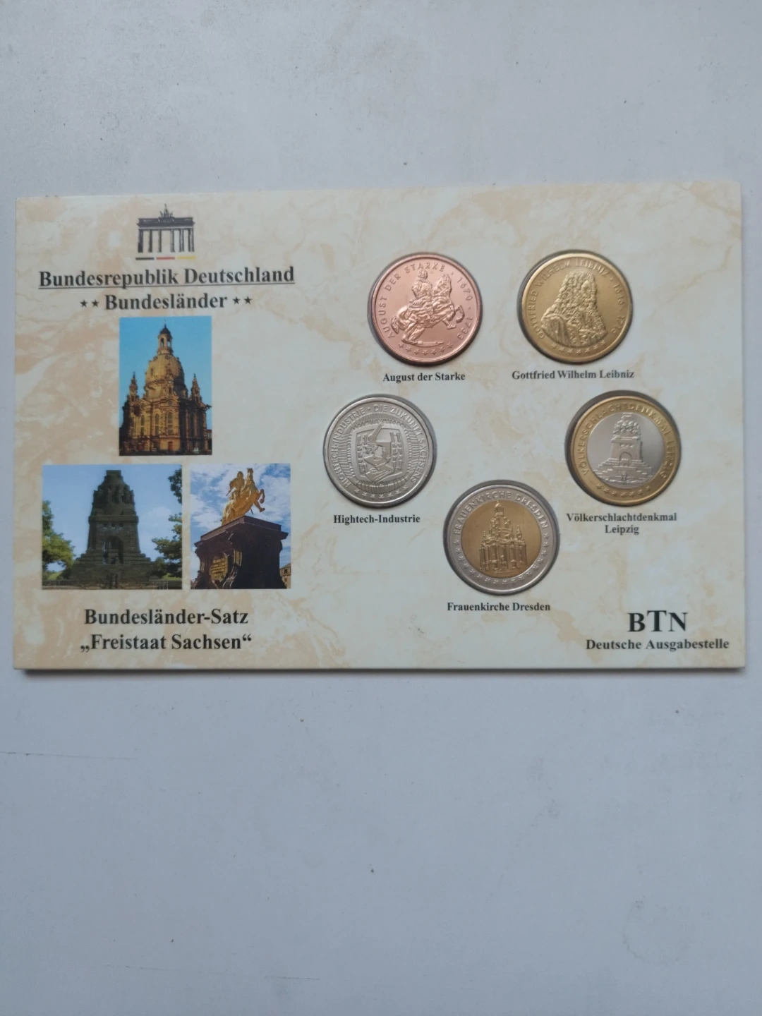 This is a "Bundesländer-Satz" coin set from the Federal Republic of Germany, featuring the "Freistaat Sachsen". It includes four coins with different designs. Specifications: Diameter 25.35 mm, Weight 10.5 g, Edge smooth. Excellent condition, like new!