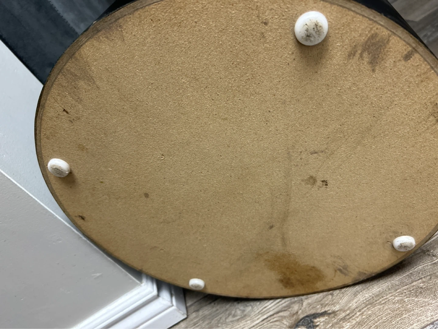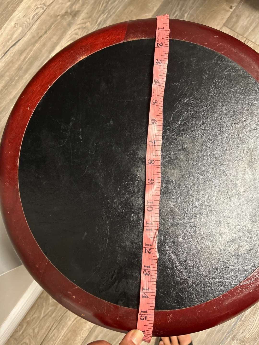 This round stool or side table features a black top and a dark red wood-look trim. It's approximately 15 inches tall. It has a black cylinder base and a dark wood-tone accent rim. Perfect as a small side table or extra seating!