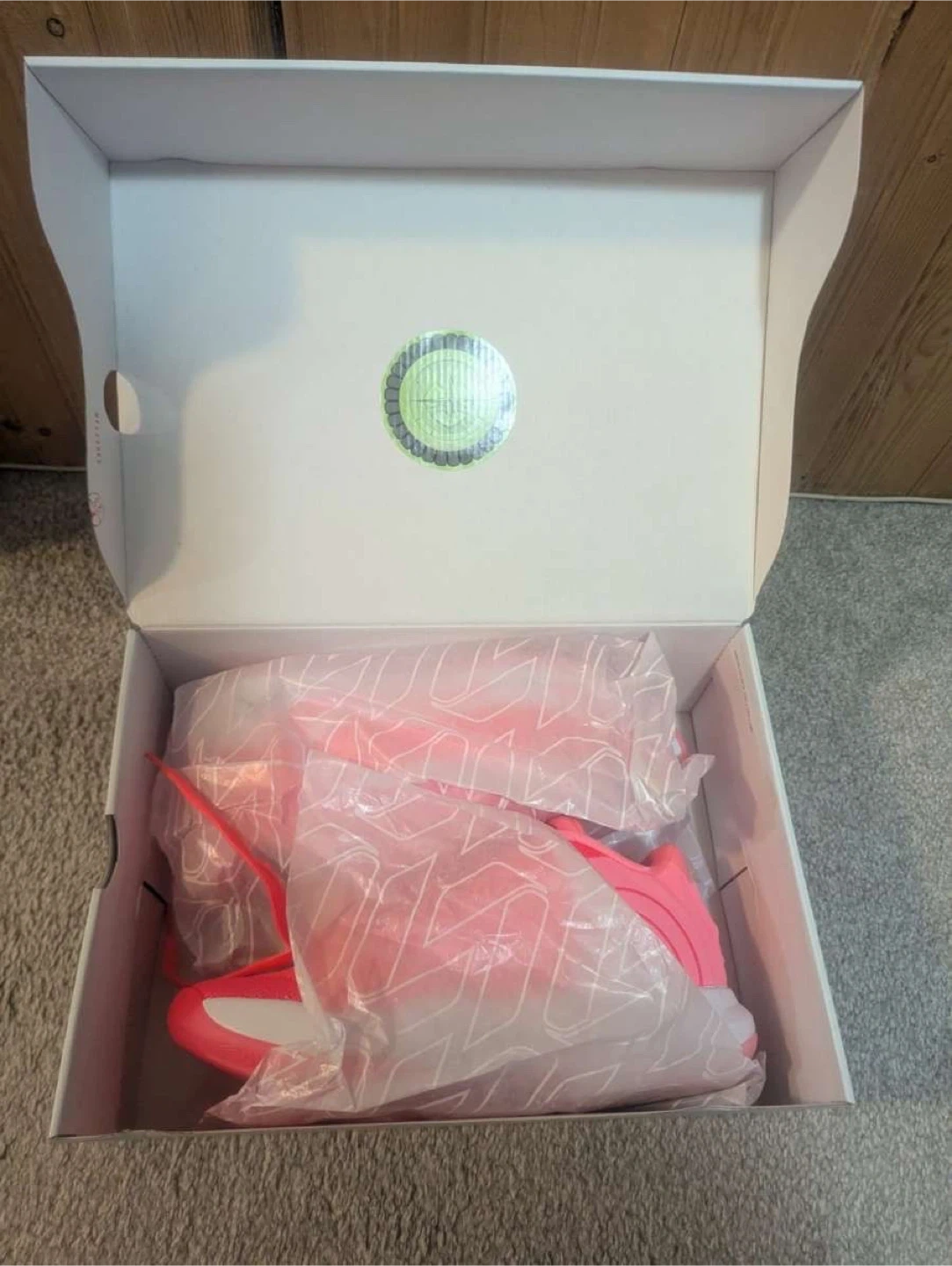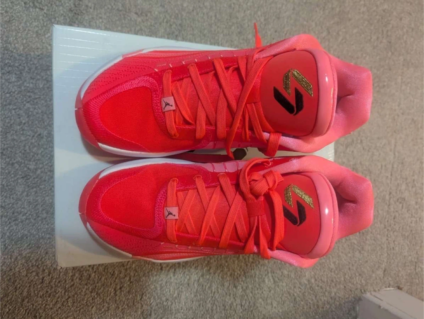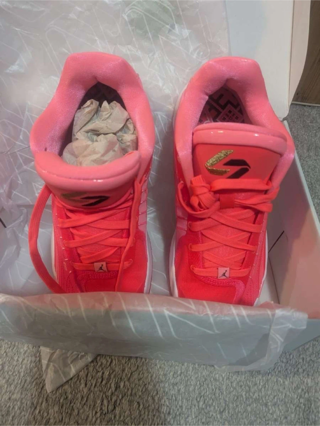 These are Luka 4 basketball shoes in a vibrant pink and coral colourway. They feature Air Zoom cushioning and come in the original box. Designed for performance on the court!
