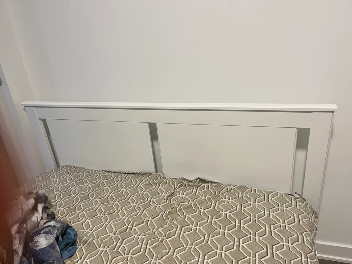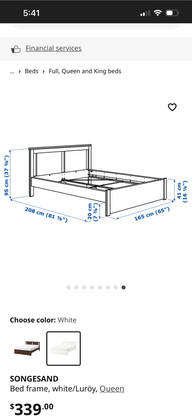 White IKEA SONGESAND queen bed frame. It's a bed frame made of particleboard, fibreboard, and foil. The total length is 208 cm and the width is 165 cm. This bed frame is suitable for a queen mattress.