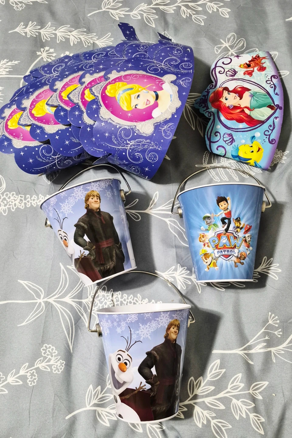 Frozen & Paw Patrol metal buckets, plus princess hats.