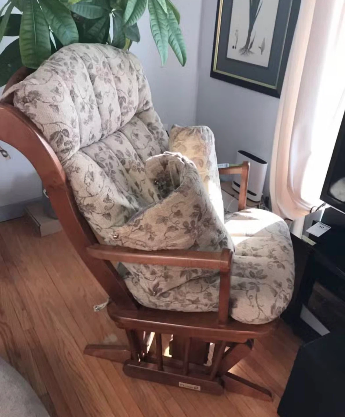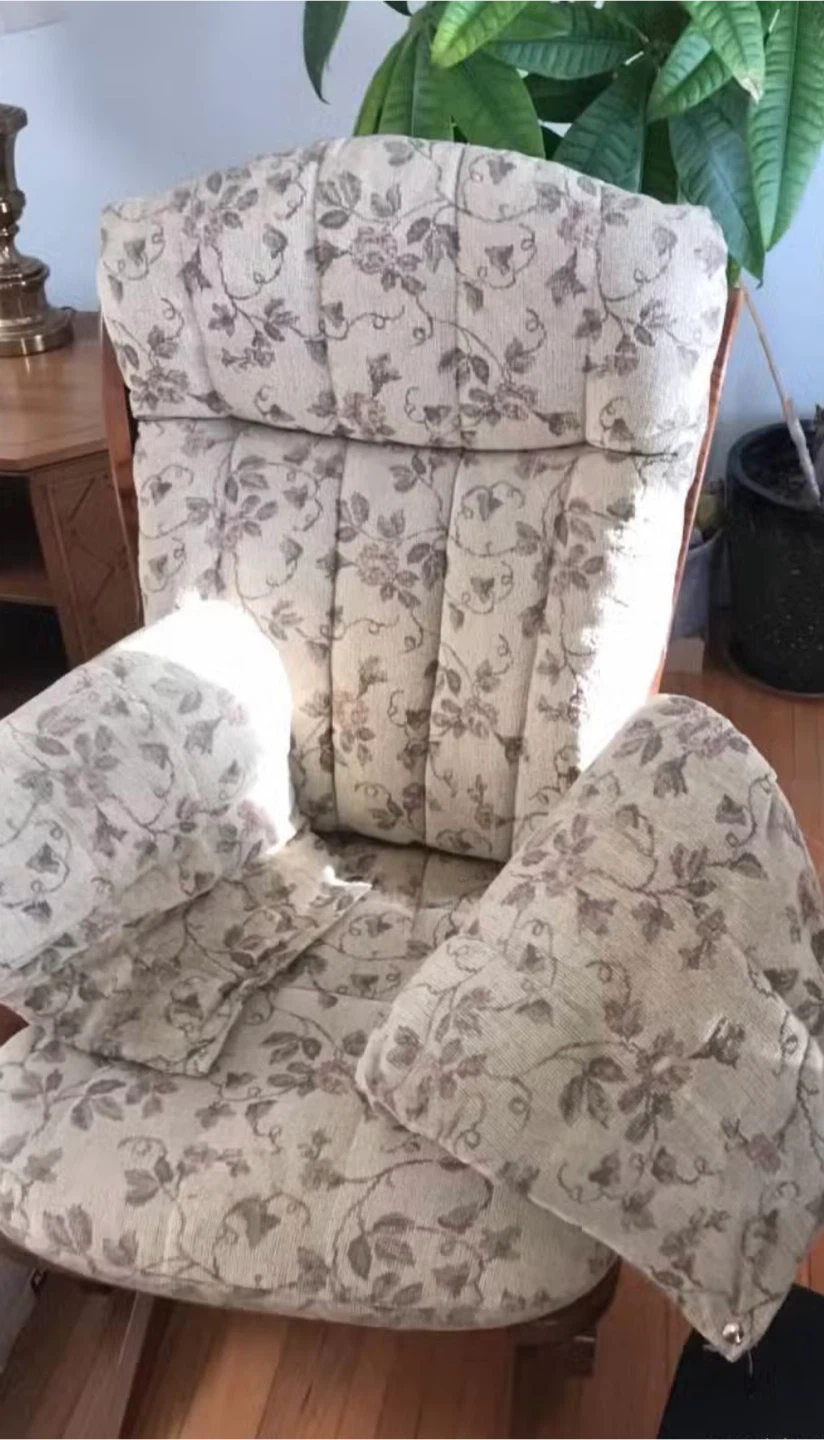 Comfortable glider rocking chair with a wooden frame and a soft floral print upholstered cushion set. Includes two throw pillows for added comfort. It's perfect for a nursery or living room.