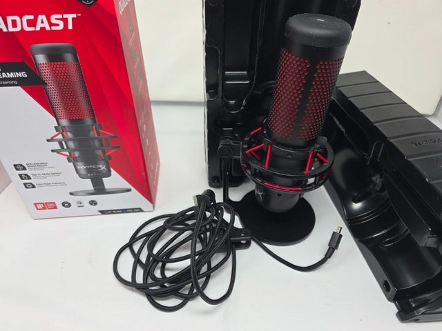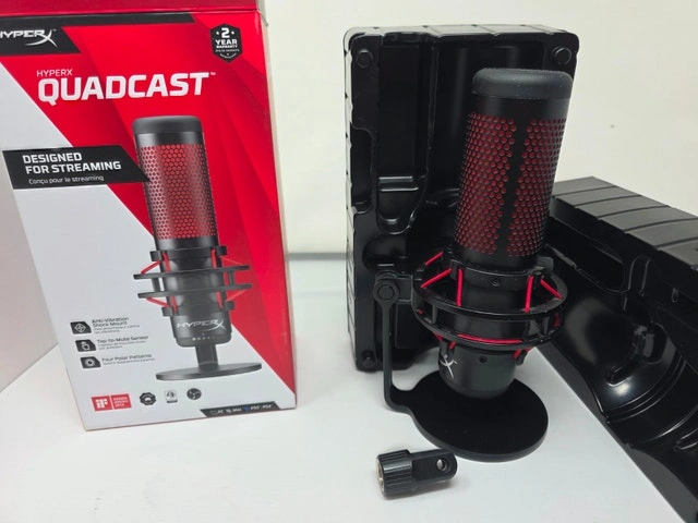 Pre-owned HyperX QuadCast microphone. Comes with box, stand, USB cable, and mount adapter.