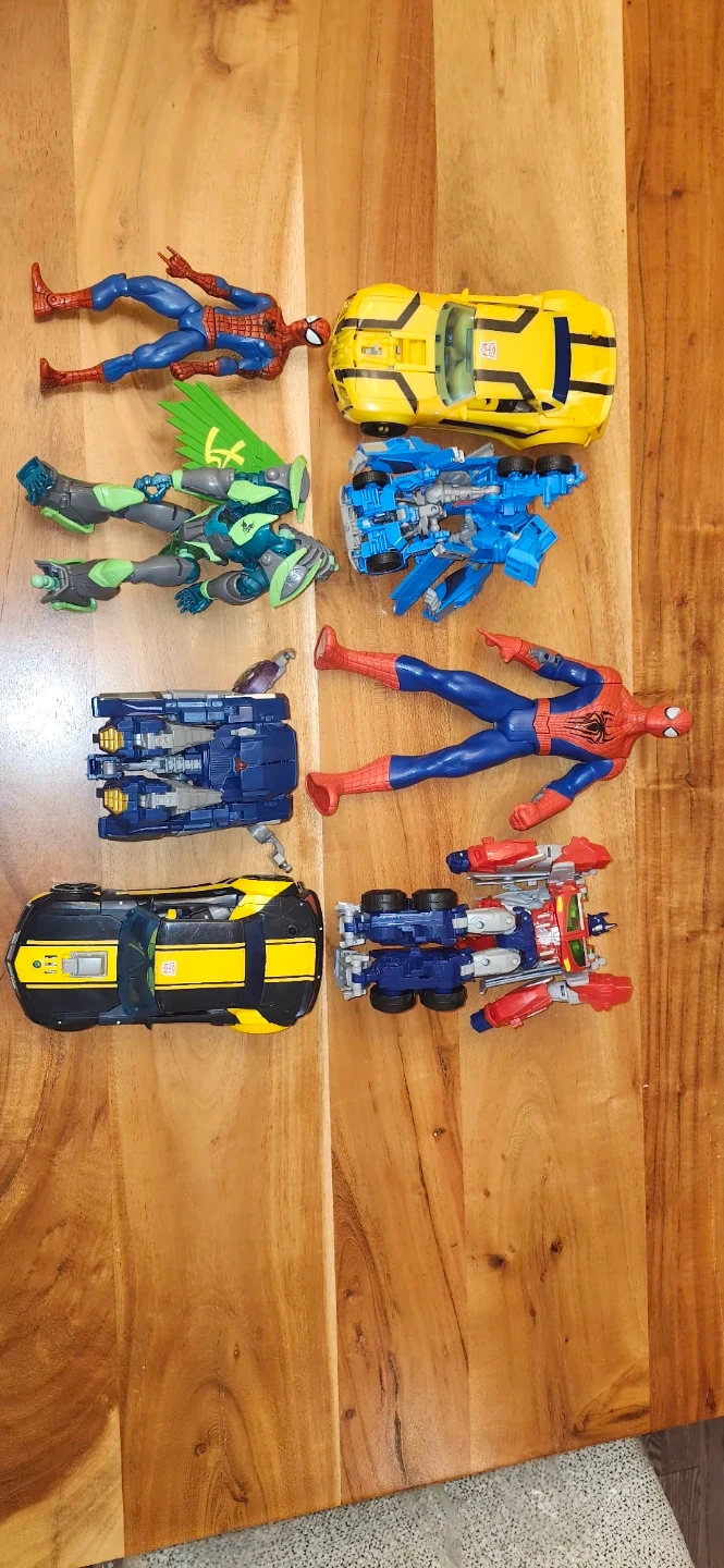 Selling a collection of action figures, including Transformers and Spiderman characters! Some transformers are missing wheels otherwise good.