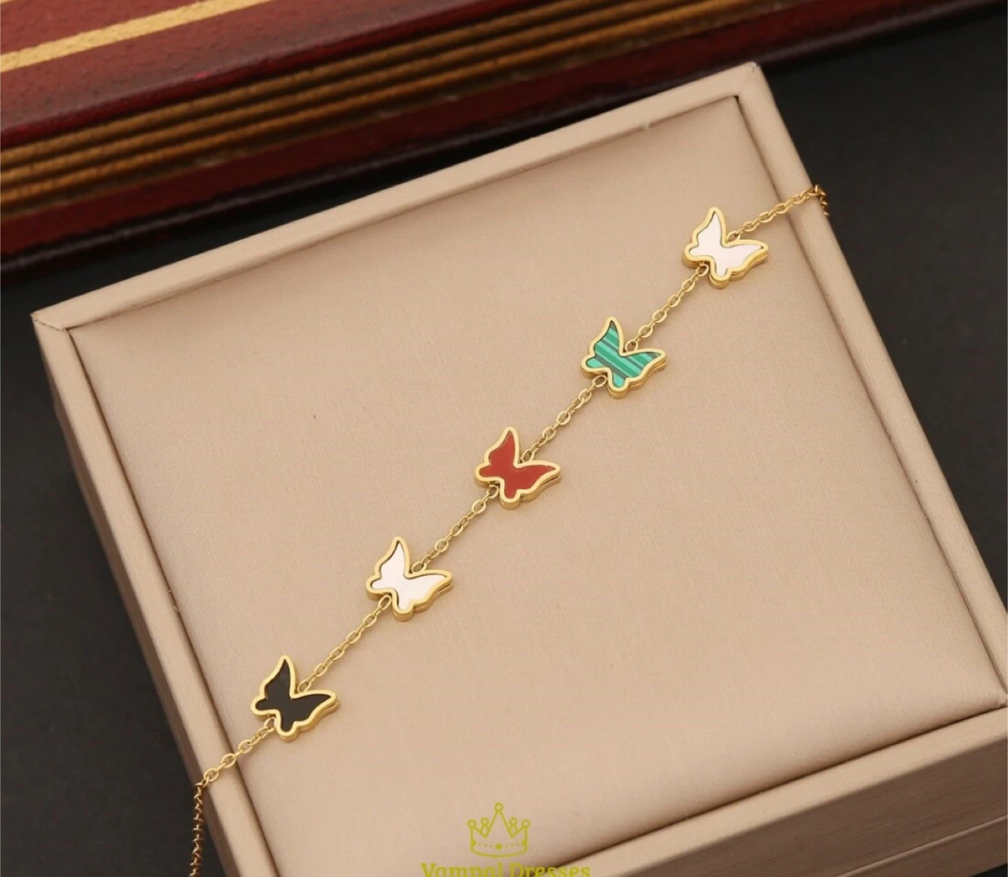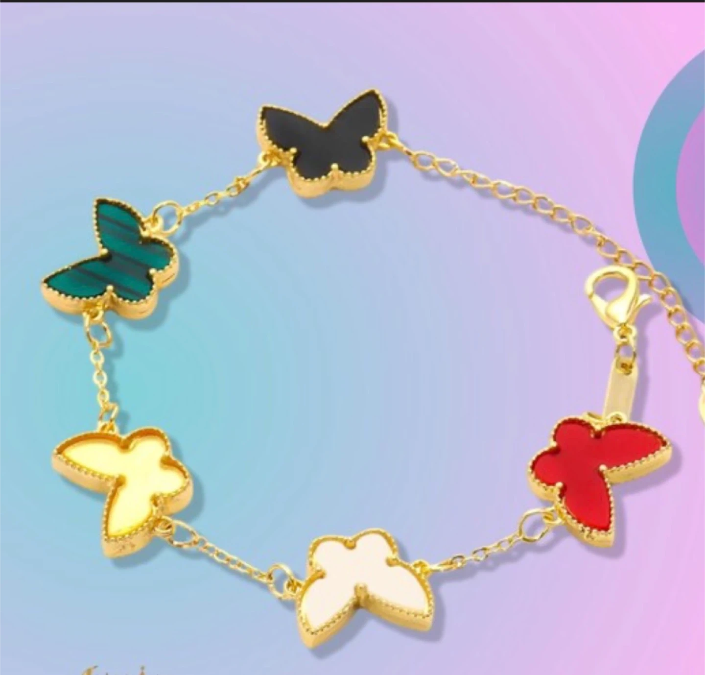 This is a beautiful butterfly bracelet with multi-colored butterflies on a gold plated chain. It's a stylish and eye-catching piece of jewelry that would make a great addition to any outfit