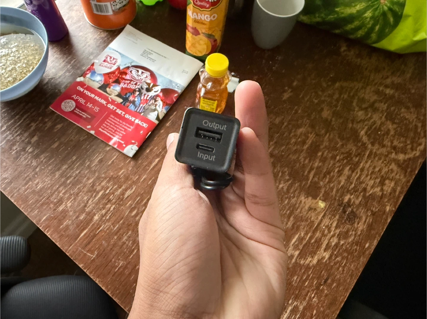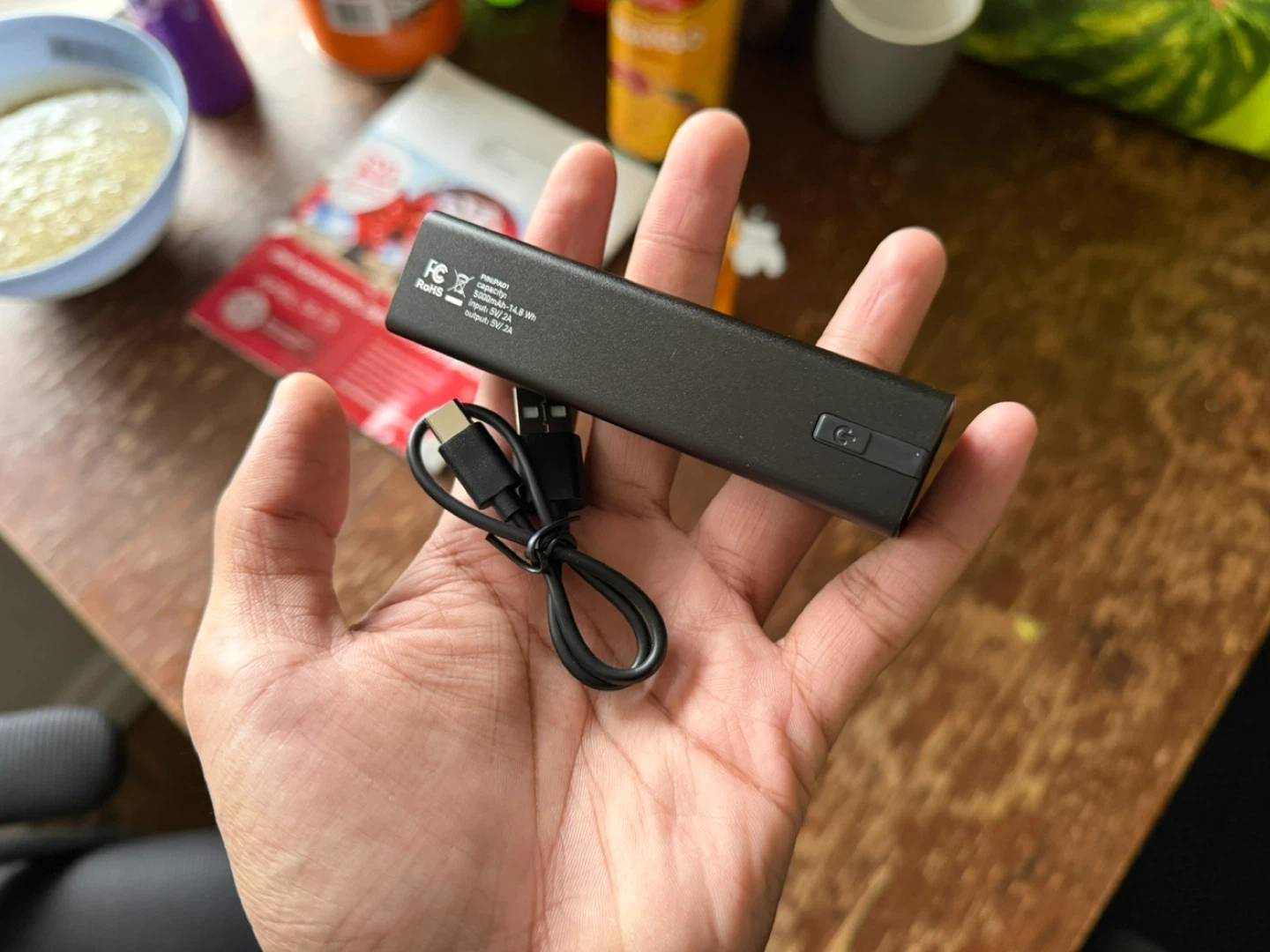 This is a black portable power bank, perfect for keeping your devices charged on the go. It features a USB-C input and output ports, and comes with a USB-C charging cable. Capacity is 5000mAh.