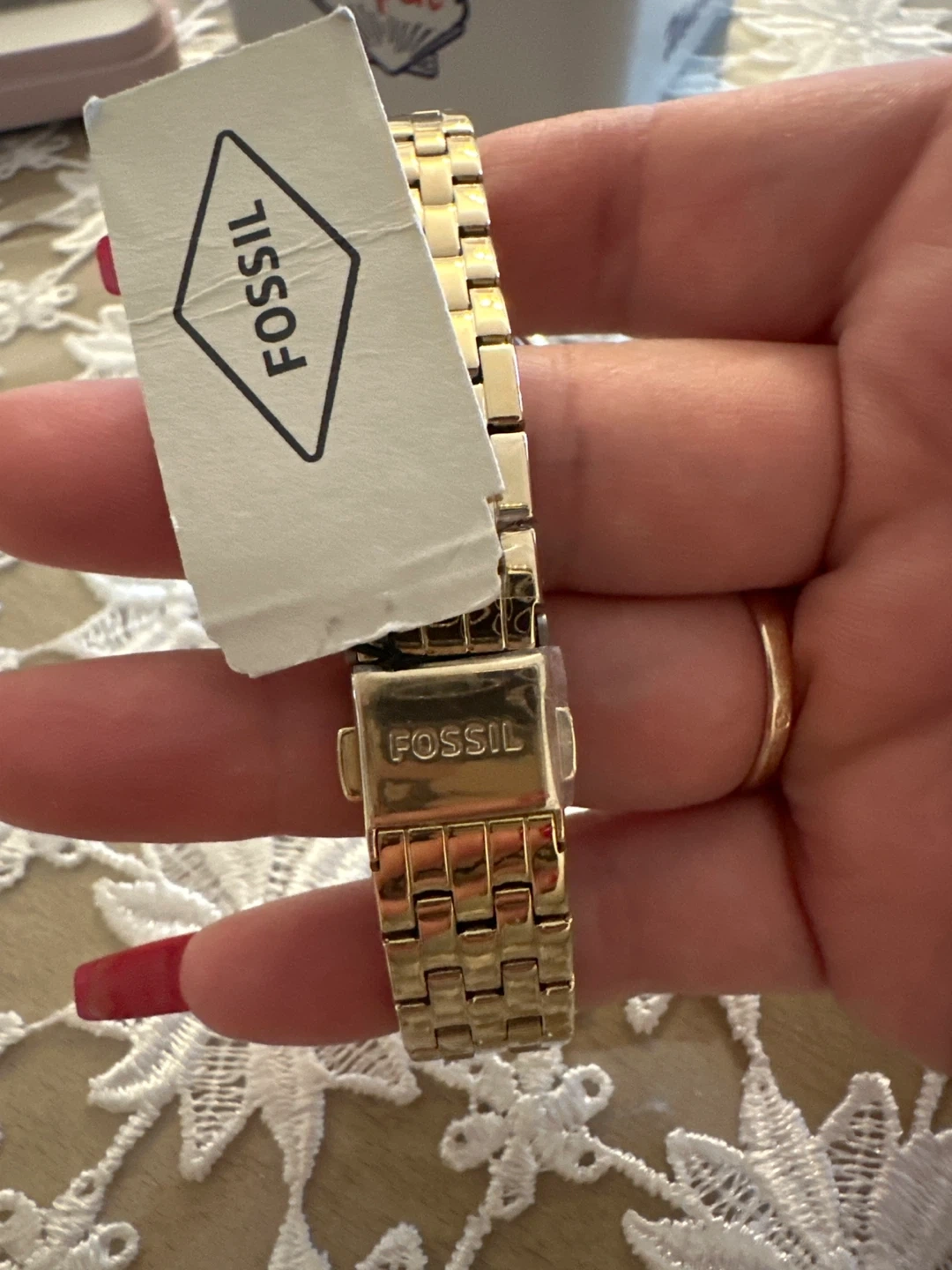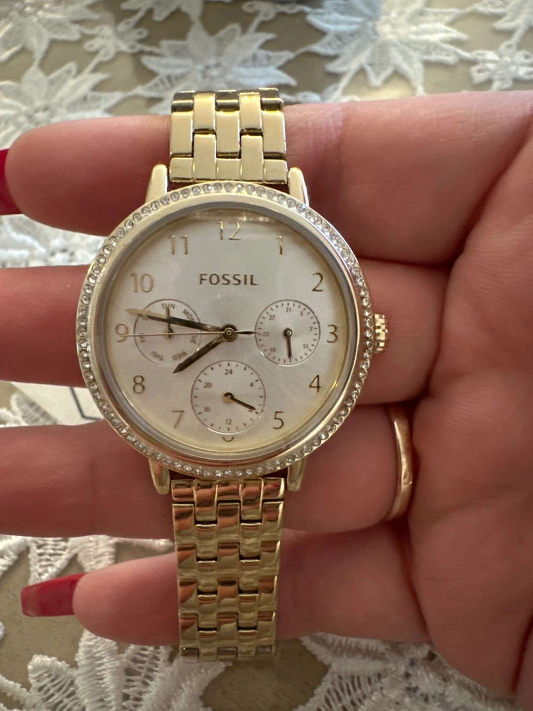 This is a gold Fossil watch with a stainless steel band. It's a stylish timepiece featuring a crystal-embellished bezel. The watch has multiple subdials for day, date, and 24-hour indication.