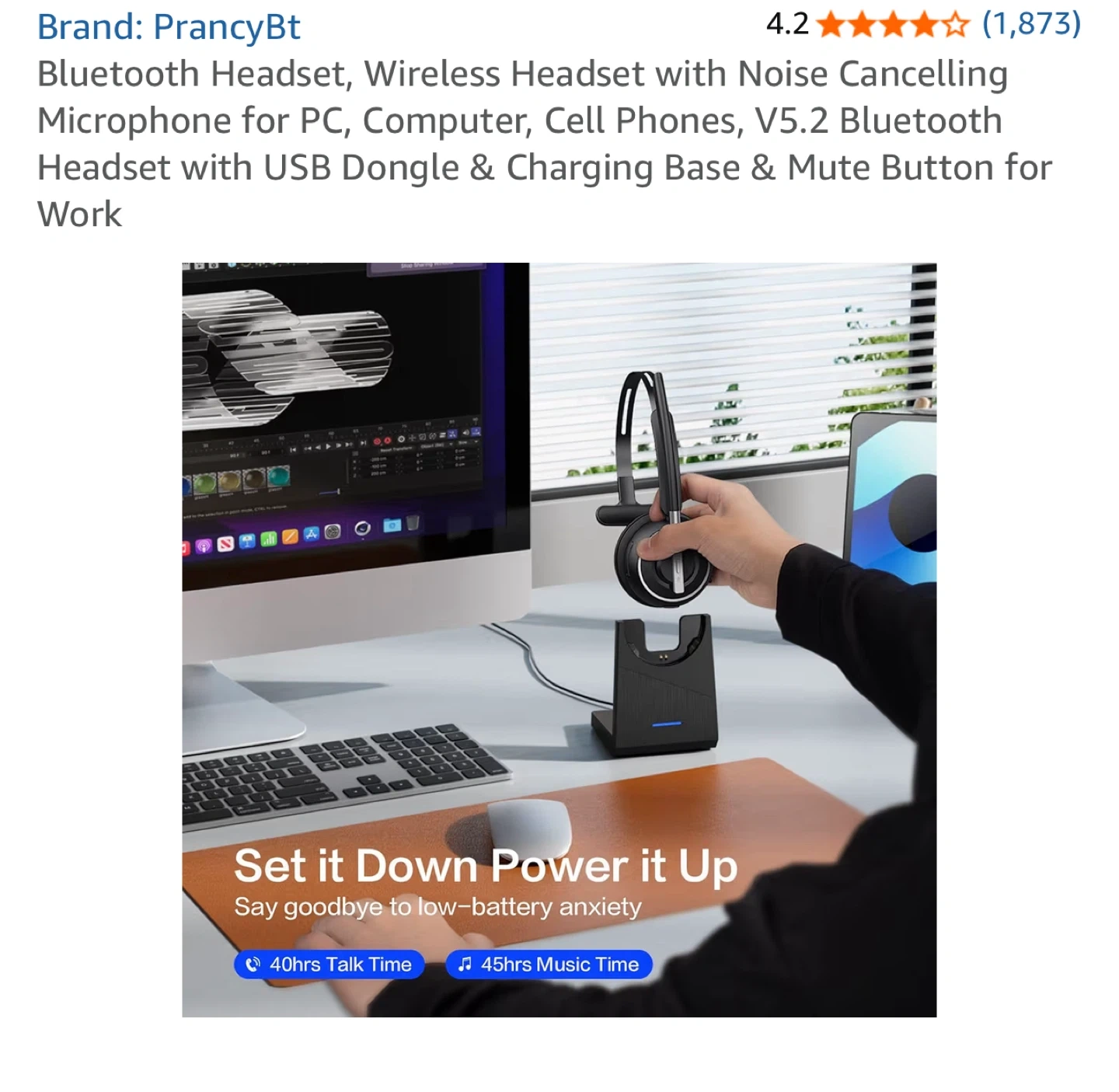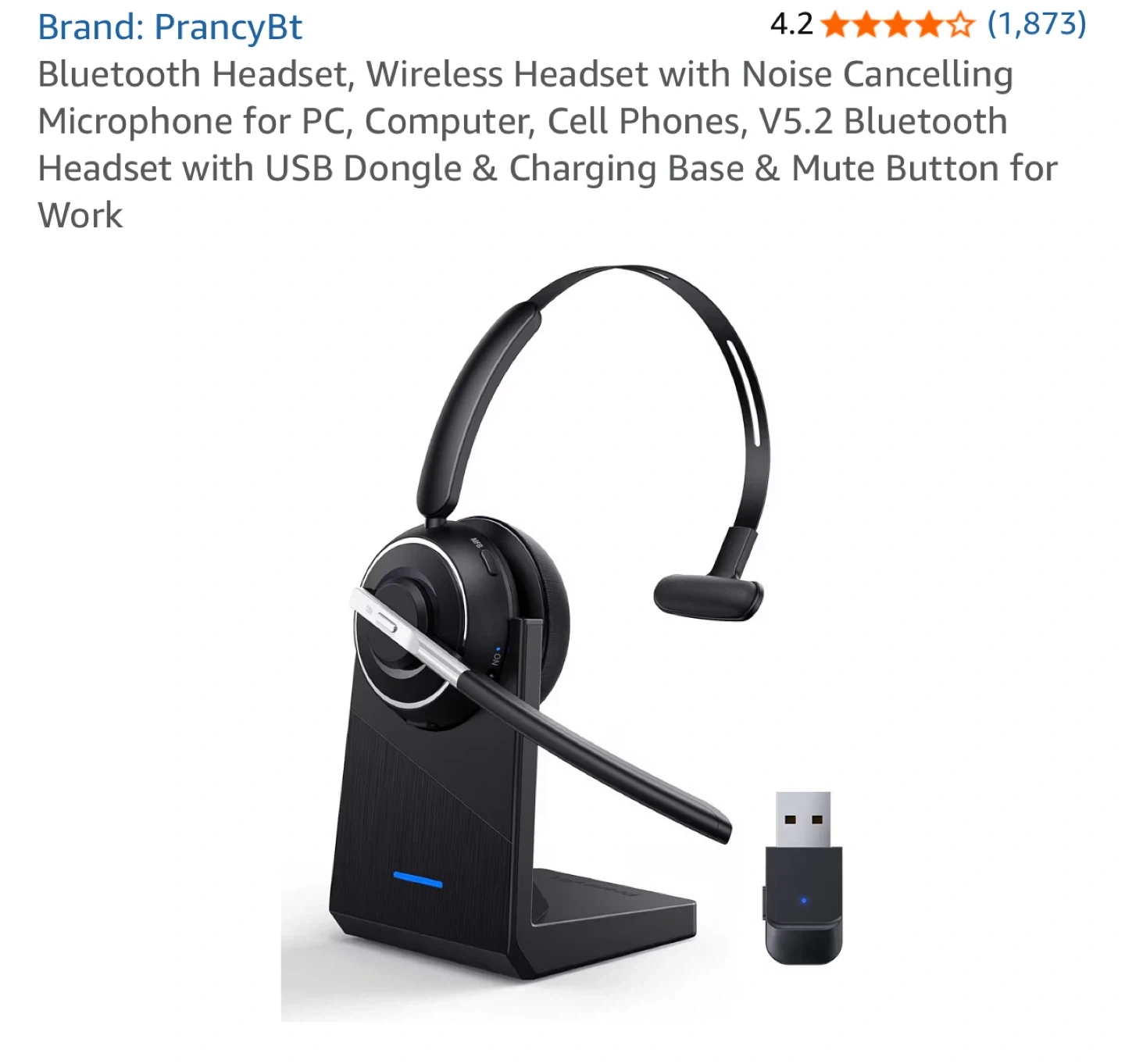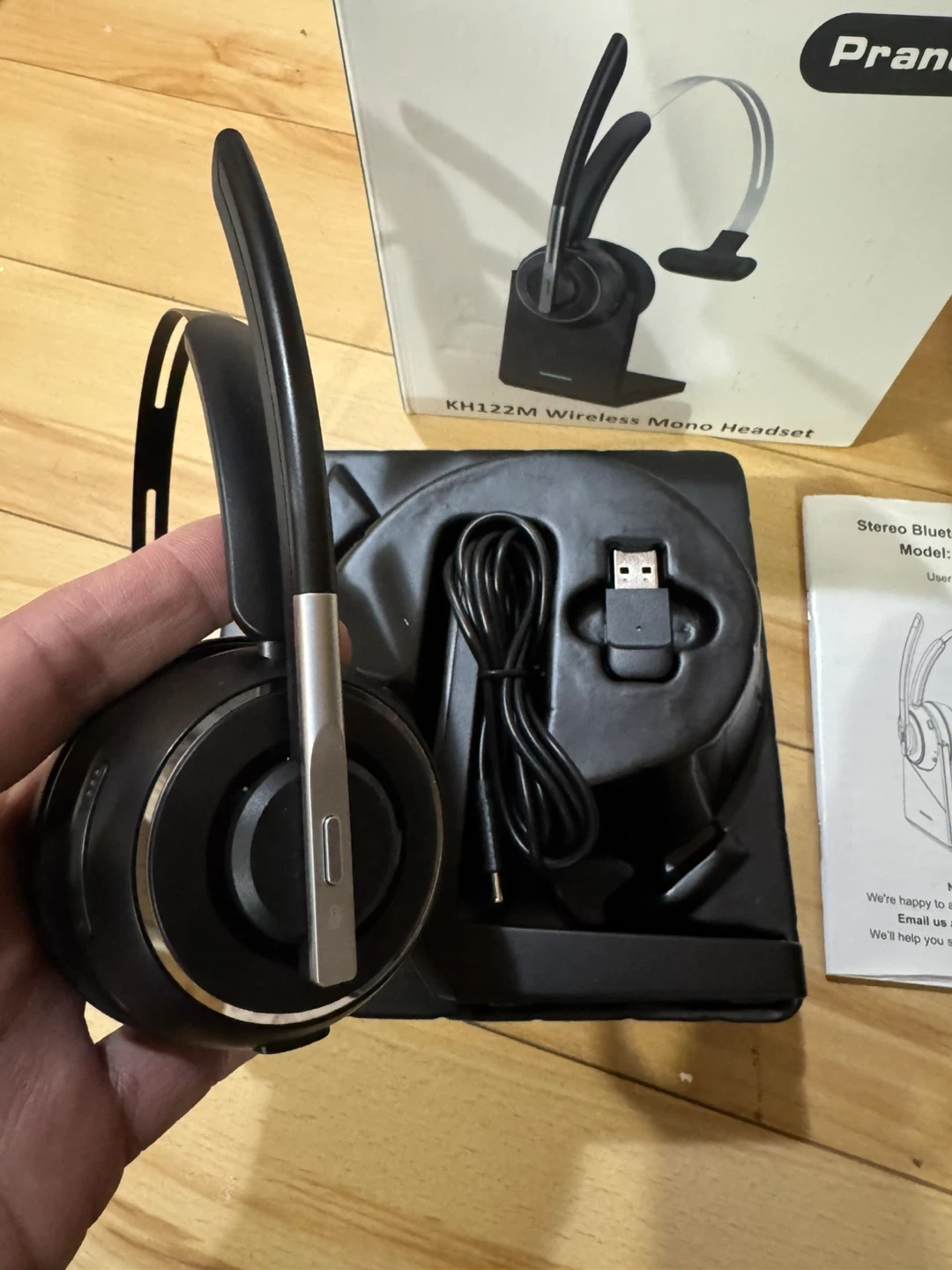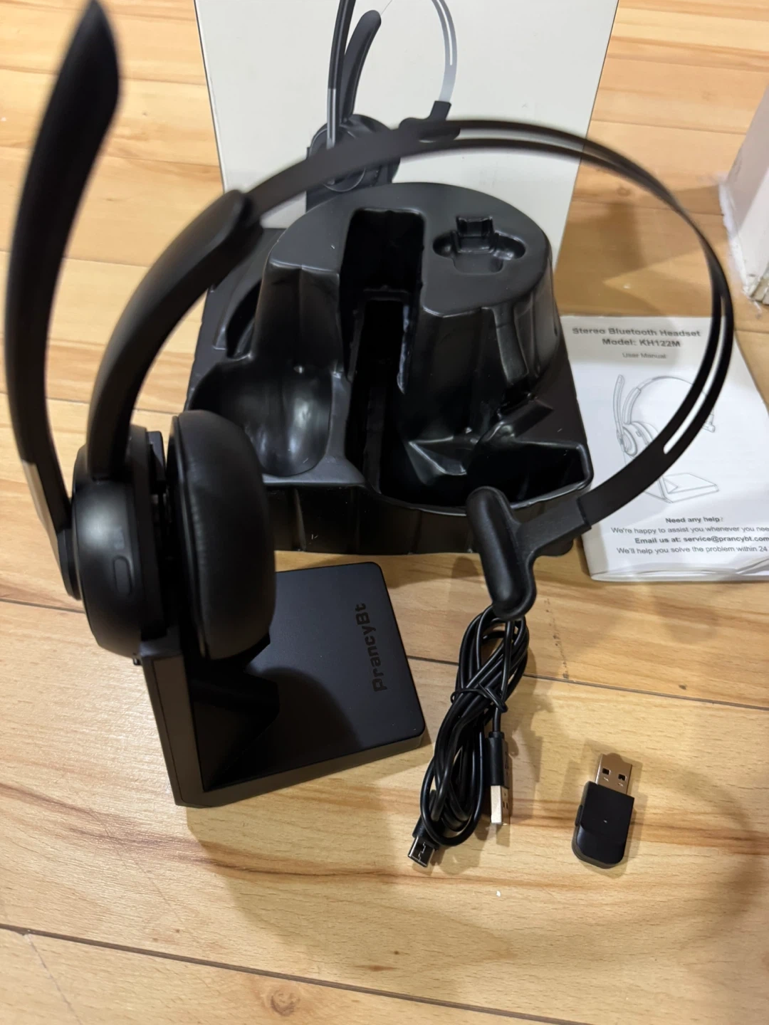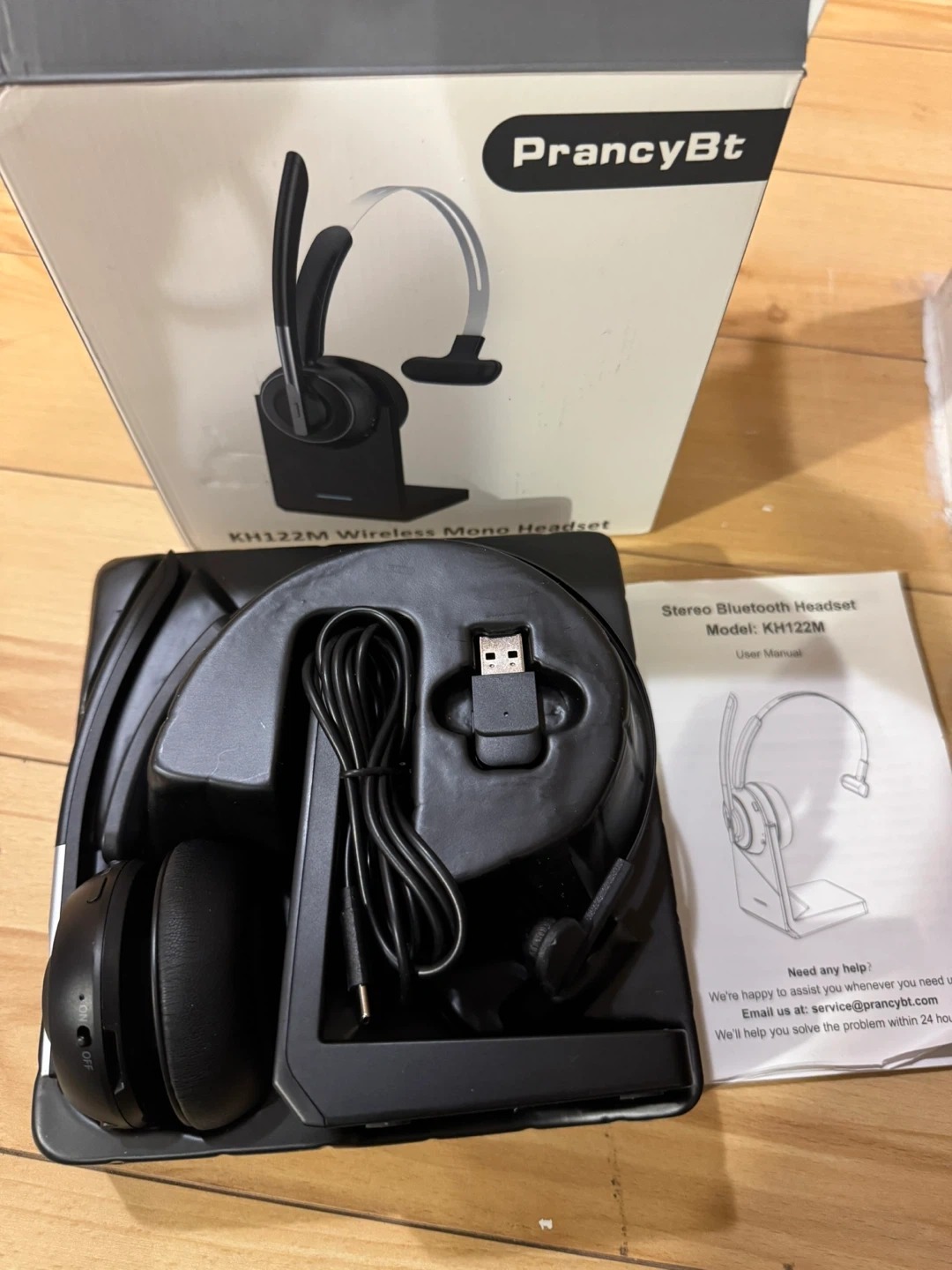 Selling a PrancyBt Bluetooth headset in great condition! It comes with a noise-cancelling microphone, perfect for PC, computer, and cell phone use. Also included is a USB dongle, charging base, and mute button for work. Comes with box and components!