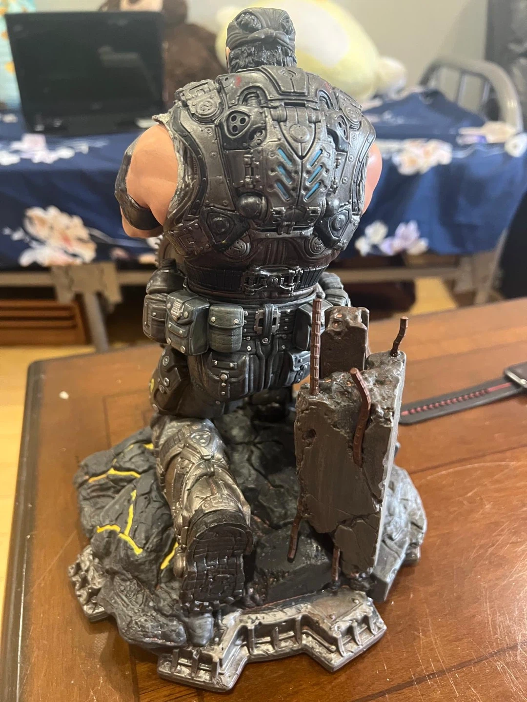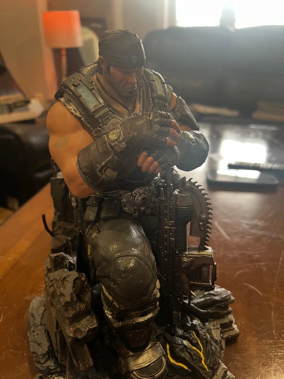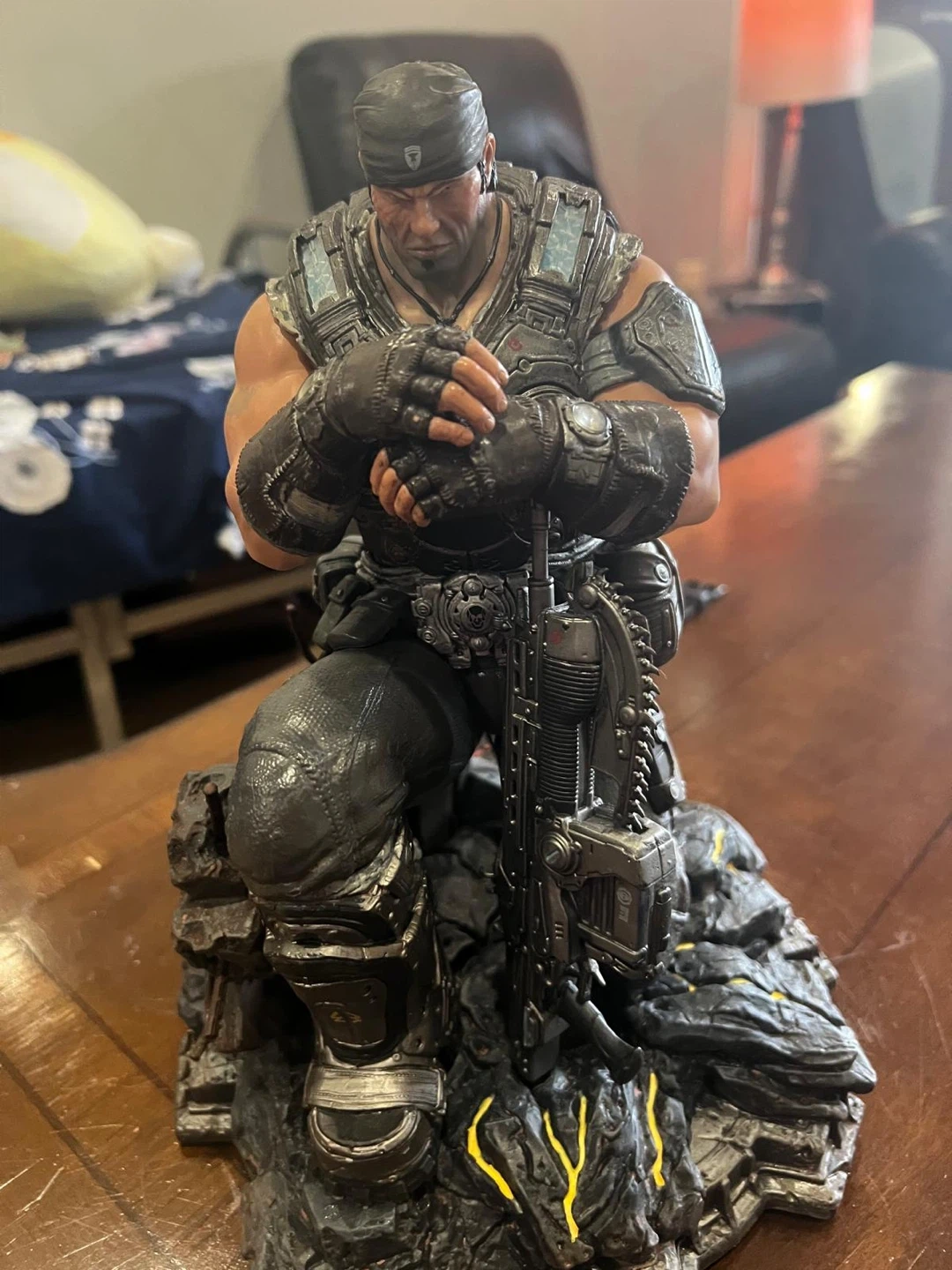 This is a detailed statue of Marcus Fenix from Gears of War. It depicts him kneeling with his iconic Lancer rifle. The base features rubble and glowing yellow accents.