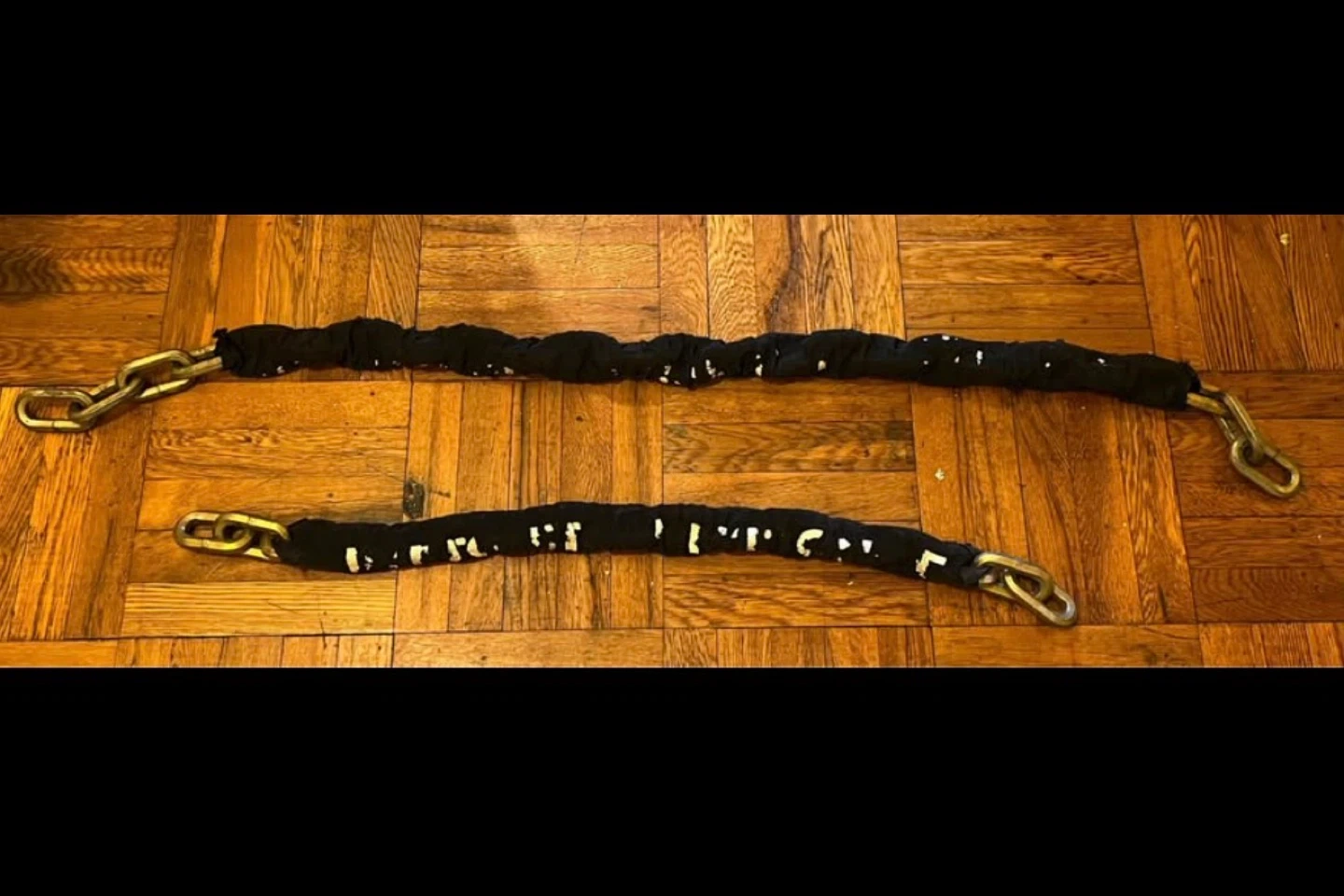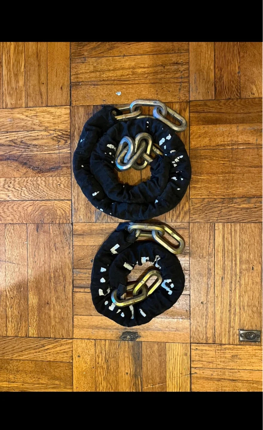 Two heavy duty chain. Each chain is covered in a black fabric sleeve with white speckles and has sturdy metal links. Provides solid security for your belongings. FOR THE SMALL CHAIN (only accepting cash)