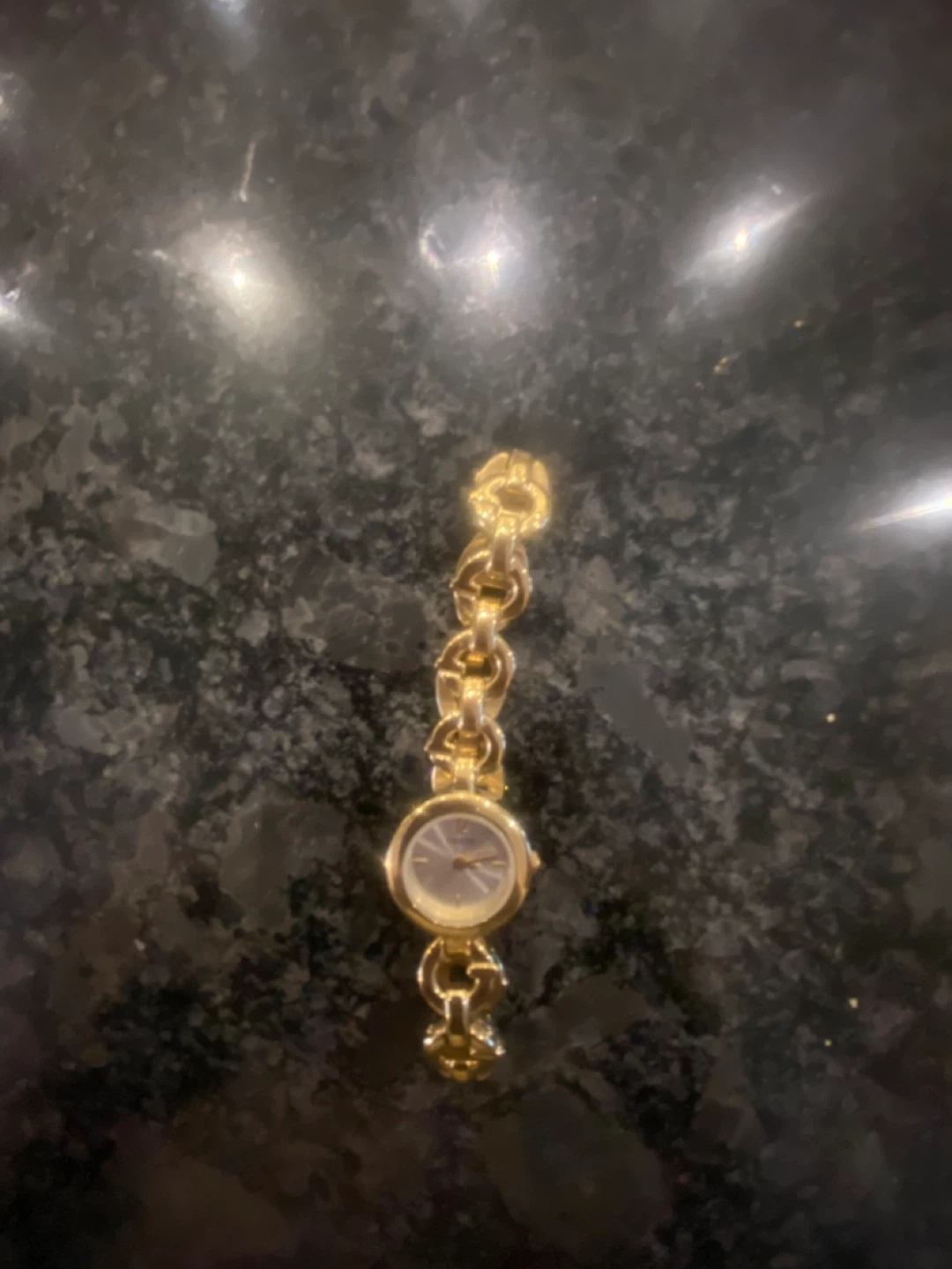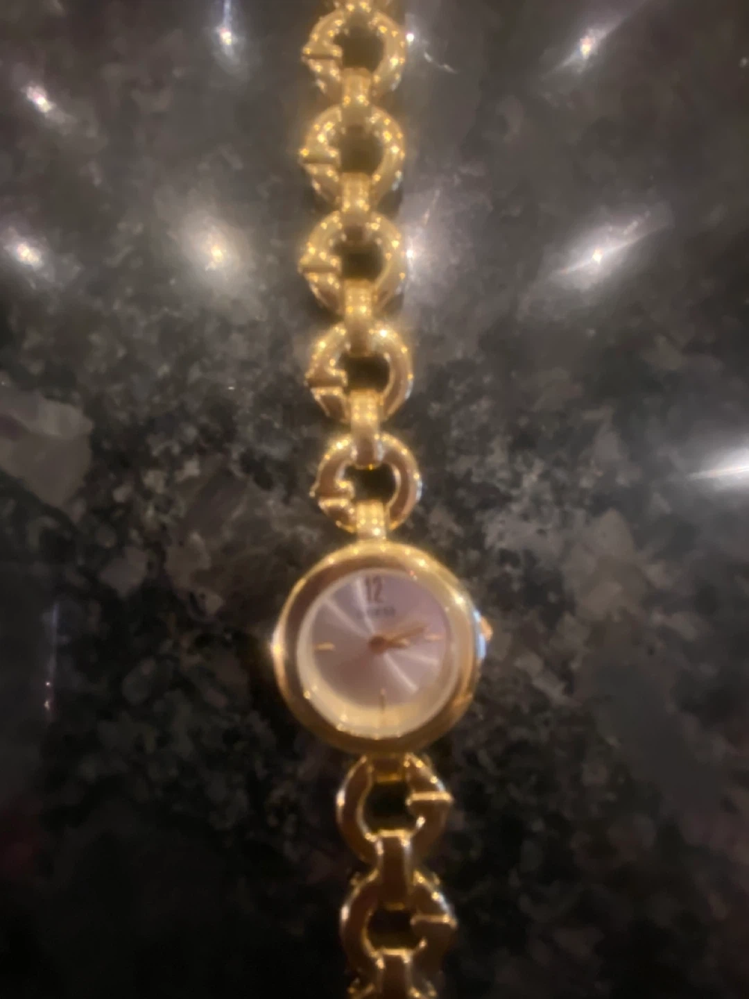 Selling a beautiful classic Guess ladies' watch with a gold-tone finish! The watch features a unique chain-link bracelet design with the 'G' logo incorporated into the links. Needs new battery.