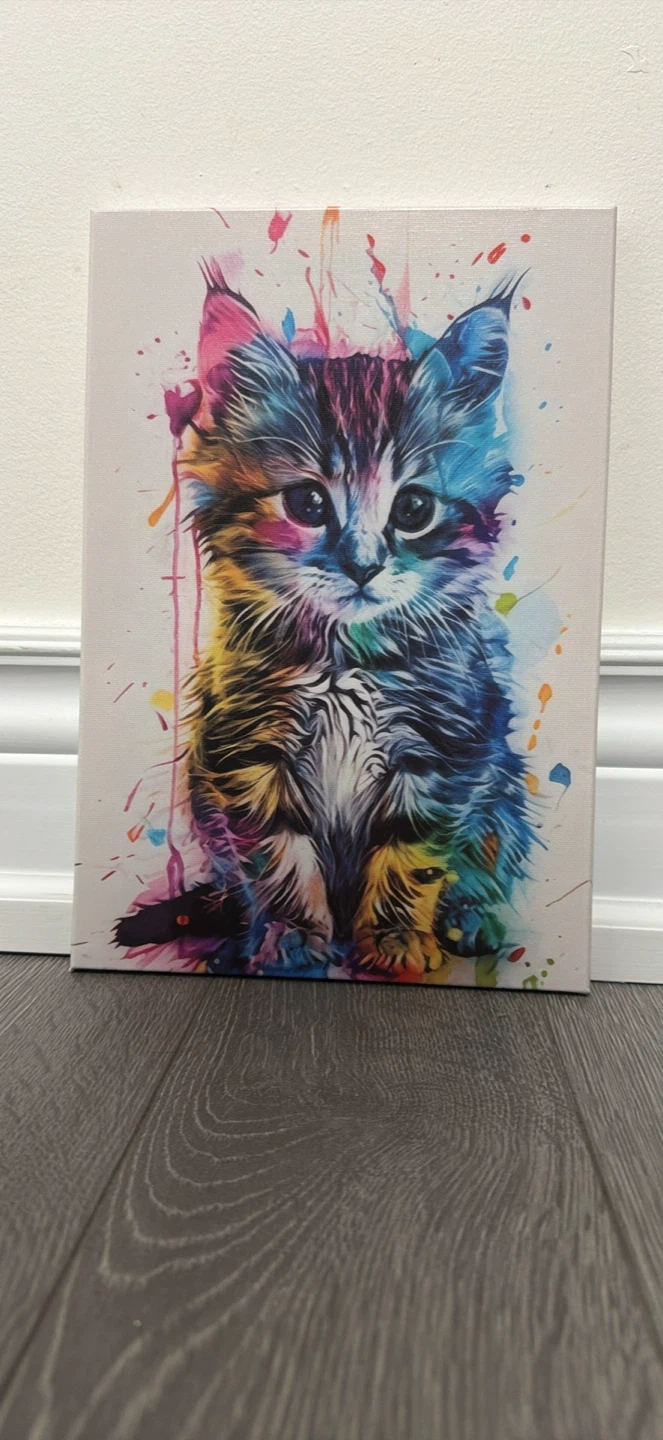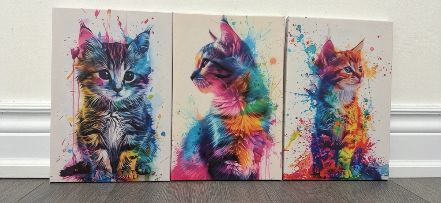 This set features three colourful kitten canvas prints with a vibrant watercolour splash design. It's a great addition to any cat lover's home. Printed on canvas with a white background.