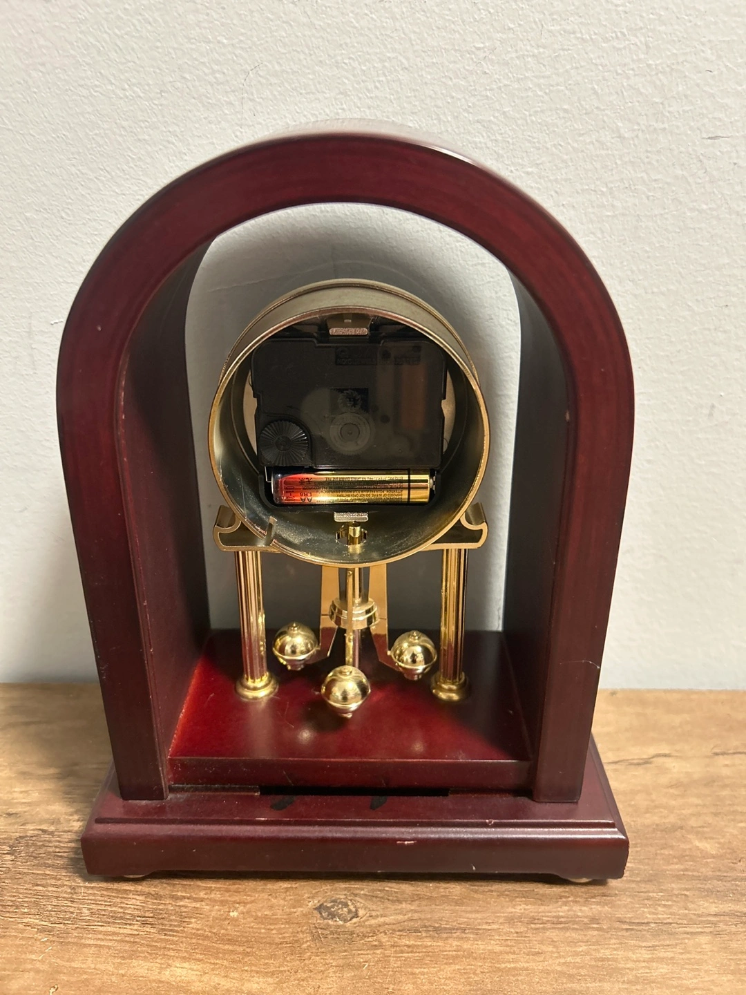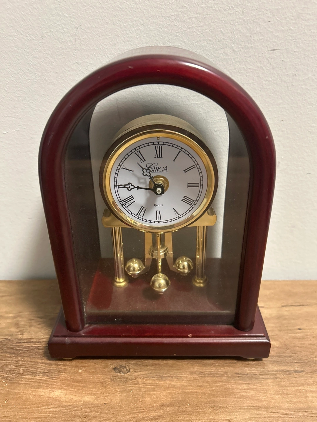 This Circa quartz mantle clock features a classic design with Roman numerals and a pendulum. It's housed in a rich, dark wood-toned casing with gold accents. Battery operated, it would look great on any shelf or table.