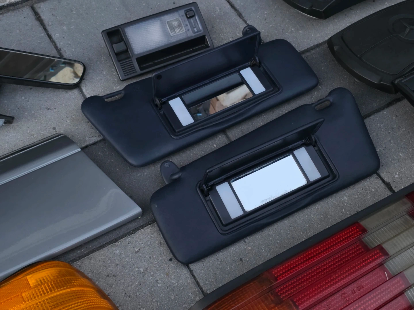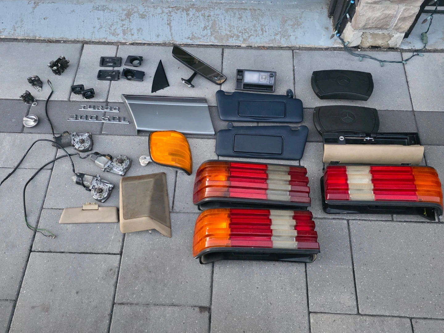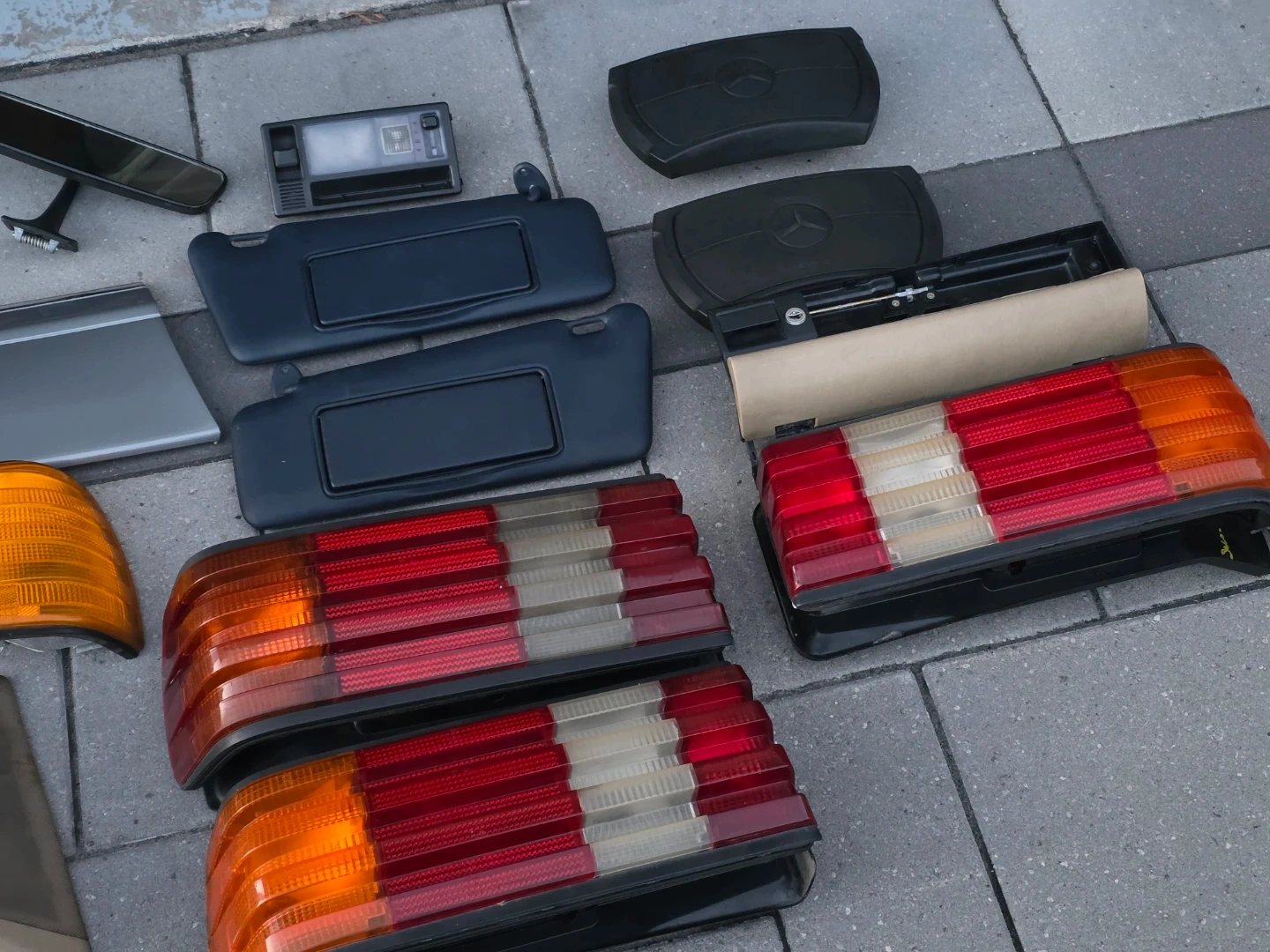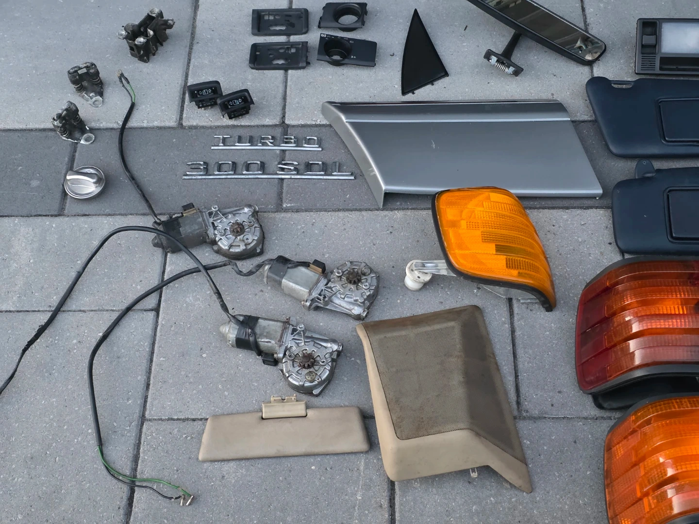 Have several parts mostly for w126 vehicles. The airbag and sun visors will also fit W124 models. Tail lights, windows motors, rear view mirror, indicator, glovebox trim, badges, etc.