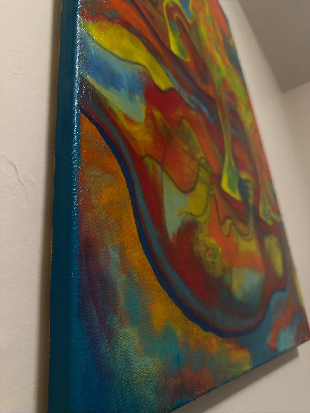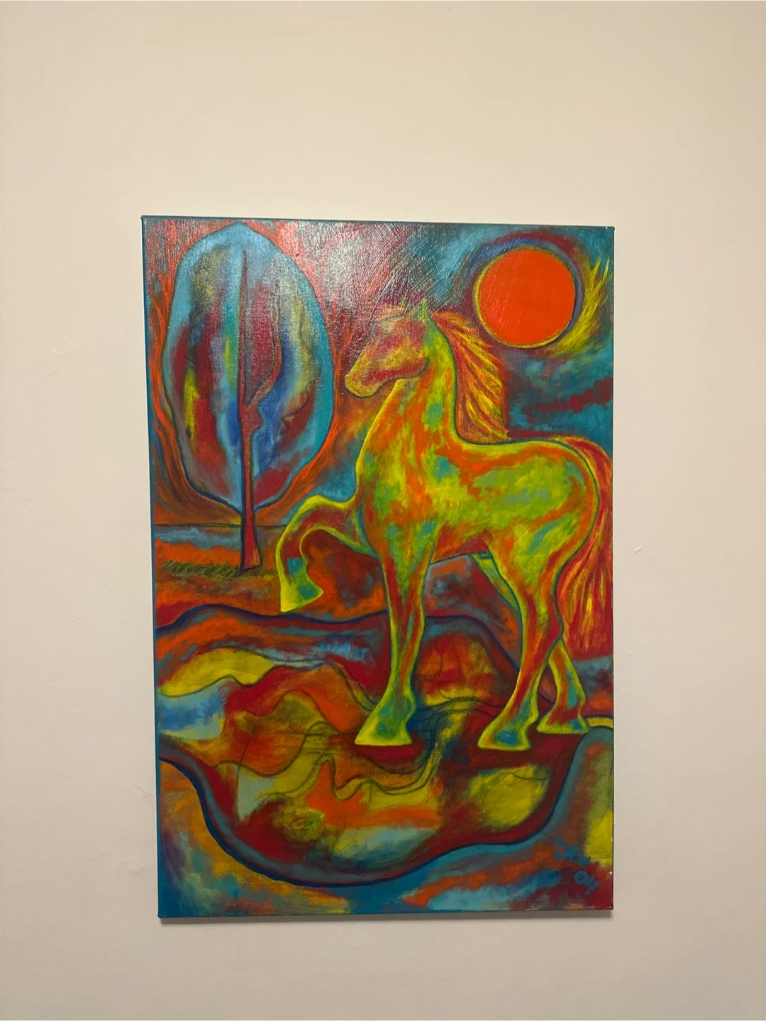 Canvas painting featuring a colourful horse and stylized tree. The artwork uses bright, abstract colours with a modern artistic style. It's ready to hang and would liven up any room!