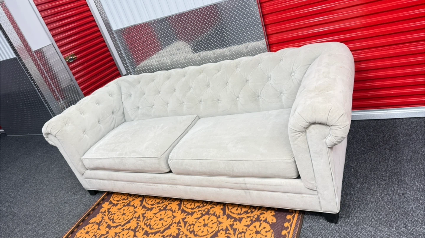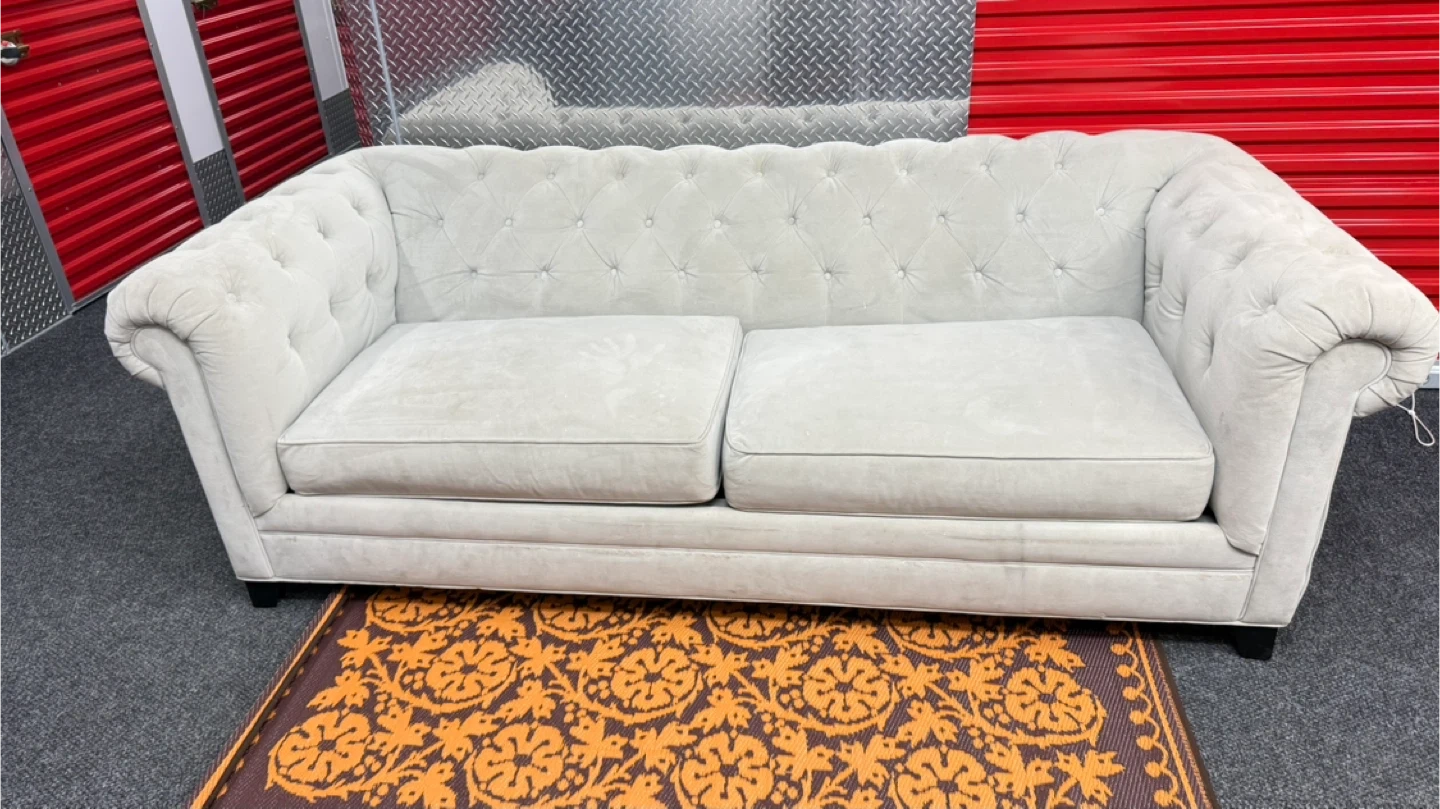 This light gray sofa features a classic tufted Chesterfield design with rolled arms. It's upholstered in a soft fabric. Two seat cushions provide comfort. It's a nice addition to any living space!