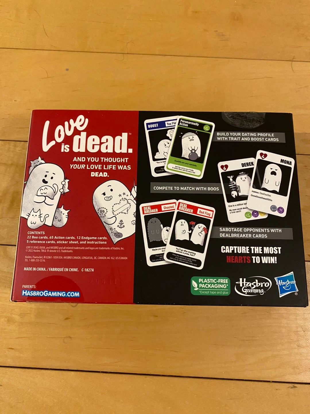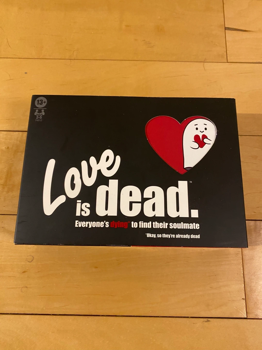 Love is Dead is a card game where everyone's dying to find their soulmate! The box includes 22 Boo cards, 65 Action cards, 12 Endgame cards, a rulesheet, and instructions. It's for ages 13+ and can be played with 2-5 players.