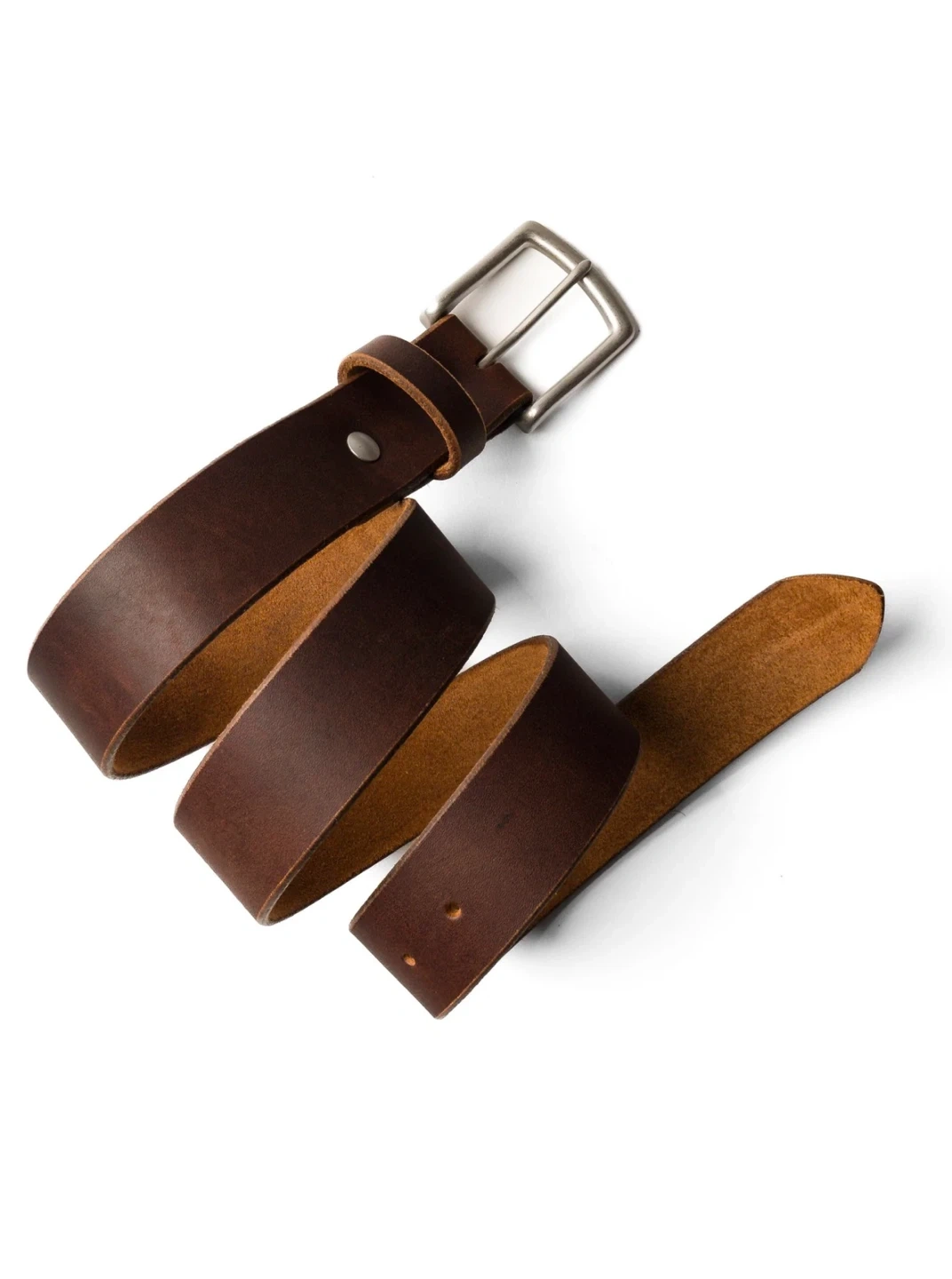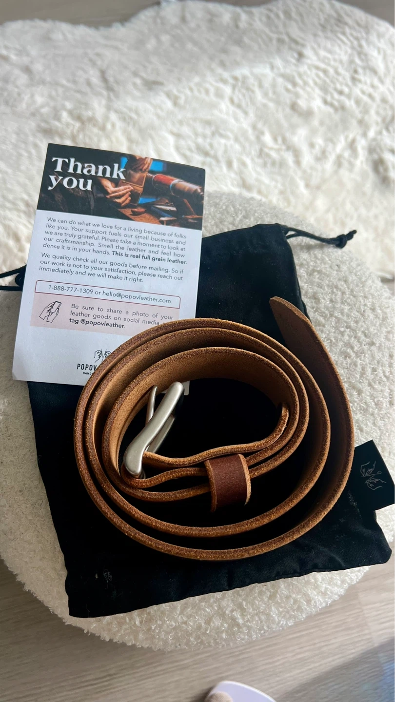 This is a Popov Leather belt crafted from full-grain leather. It features a replaceable solid brass buckle and a 1.5" strap width. This belt's leather develops a unique patina over time.