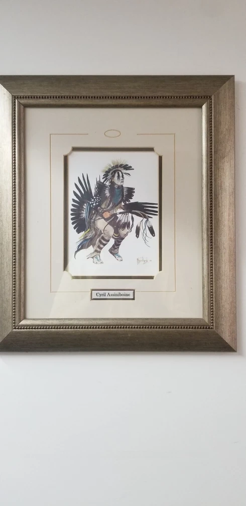 Beautiful framed art print. Features a painting of a Native American dancer. Artist signature visible. Presented in a gold-toned frame. A collectible piece.