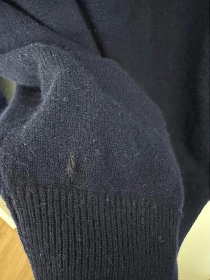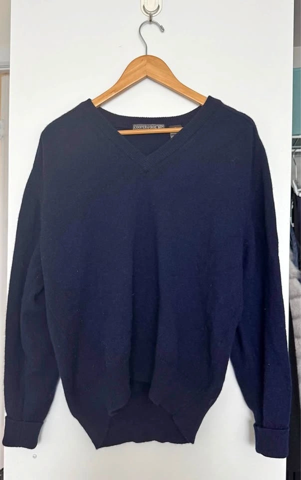 Beautiful dark blue sweater, 100% new lambswool from New England. Machine washable, air dry. Small hole from being caught on a clothing hanger. Men's size large.