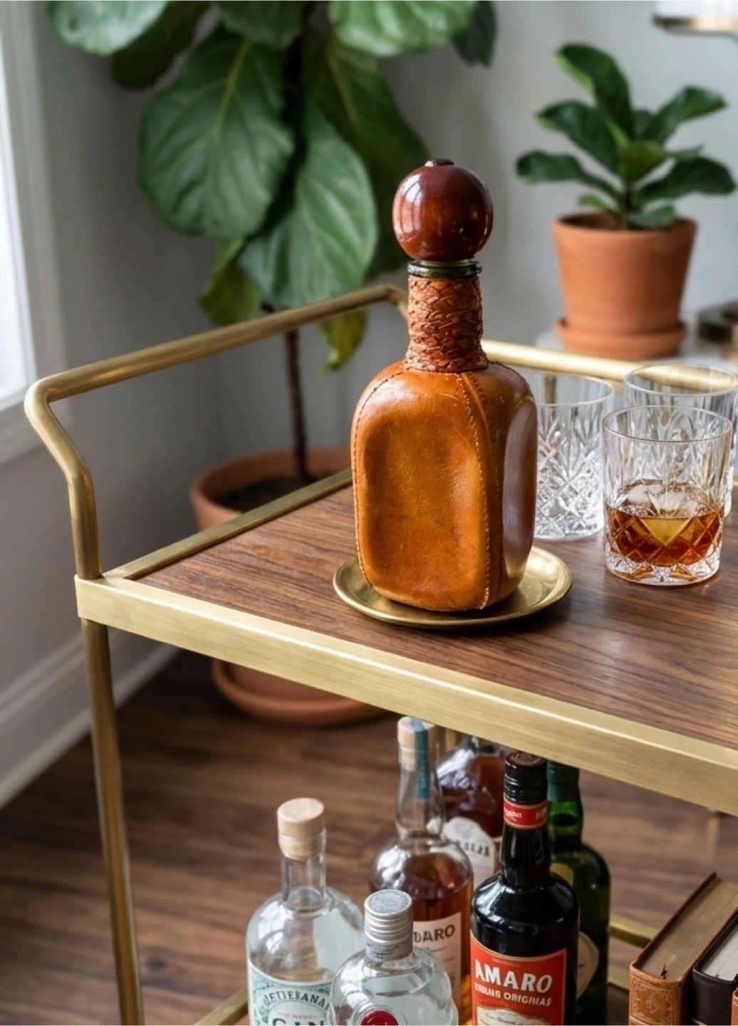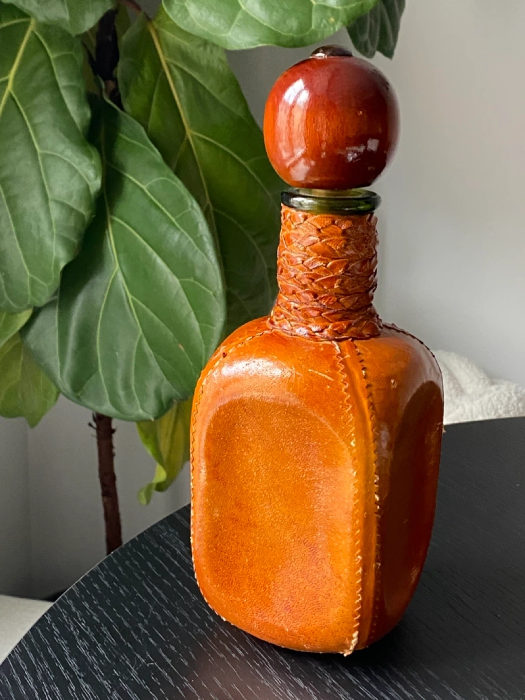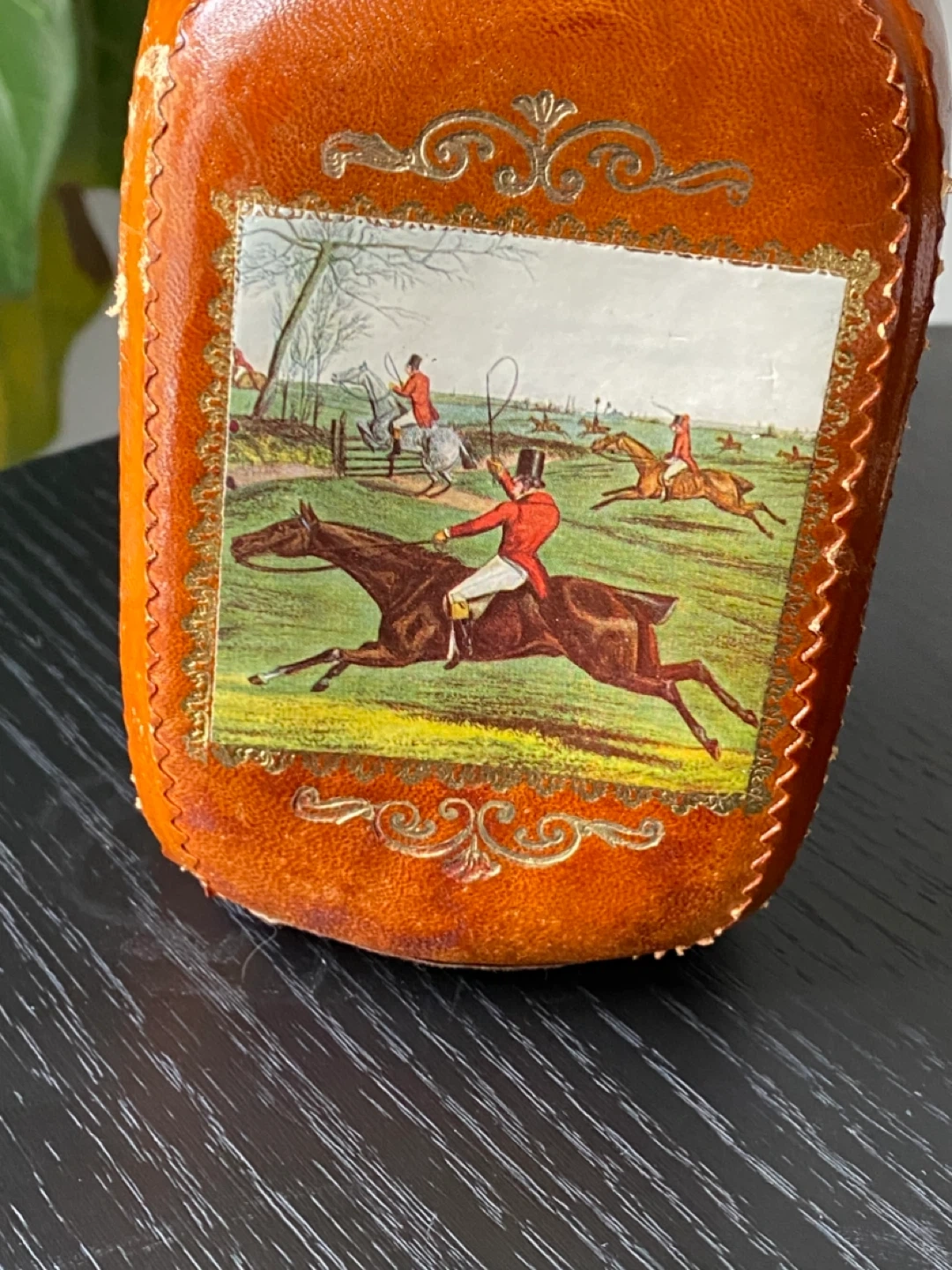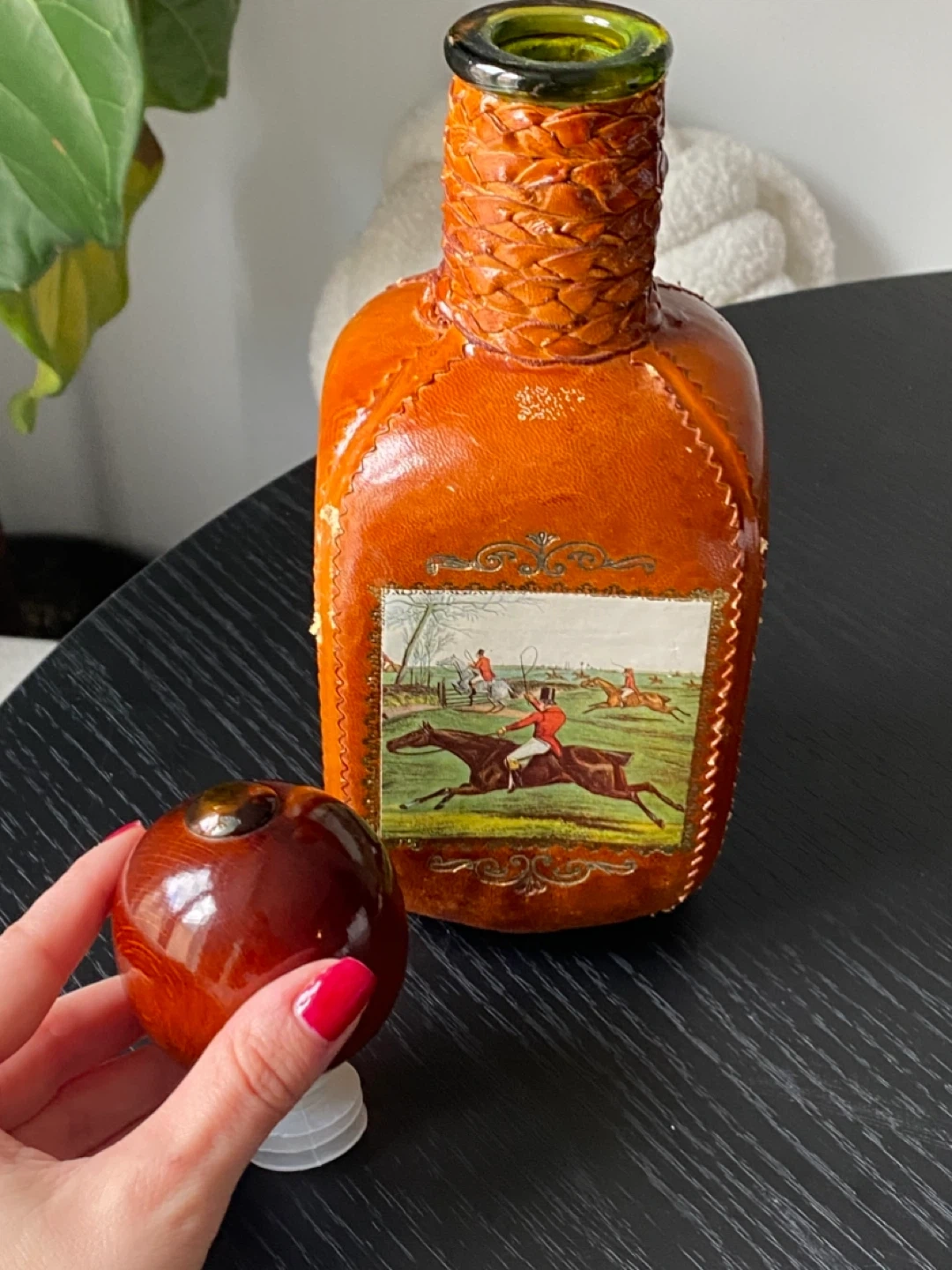 This is a vintage decanter wrapped in genuine leather, featuring a charming hunting scene. It's made in Italy and includes the original wooden stopper. The craftsmanship is excellent!