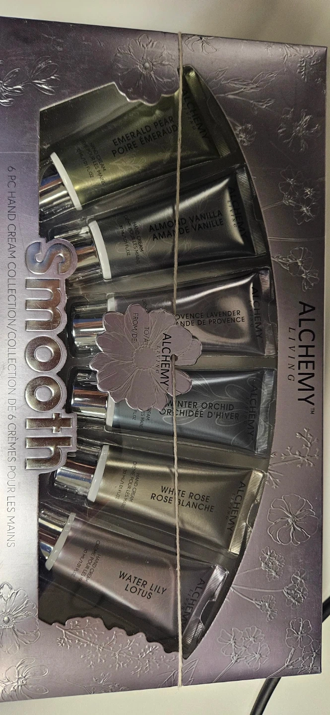 This is a 6-piece hand cream collection from Alchemy Living. It includes various scents like Emerald Pear, Almond Vanilla, Provence Lavender, Winter Orchid, White Rose, and Water Lily.