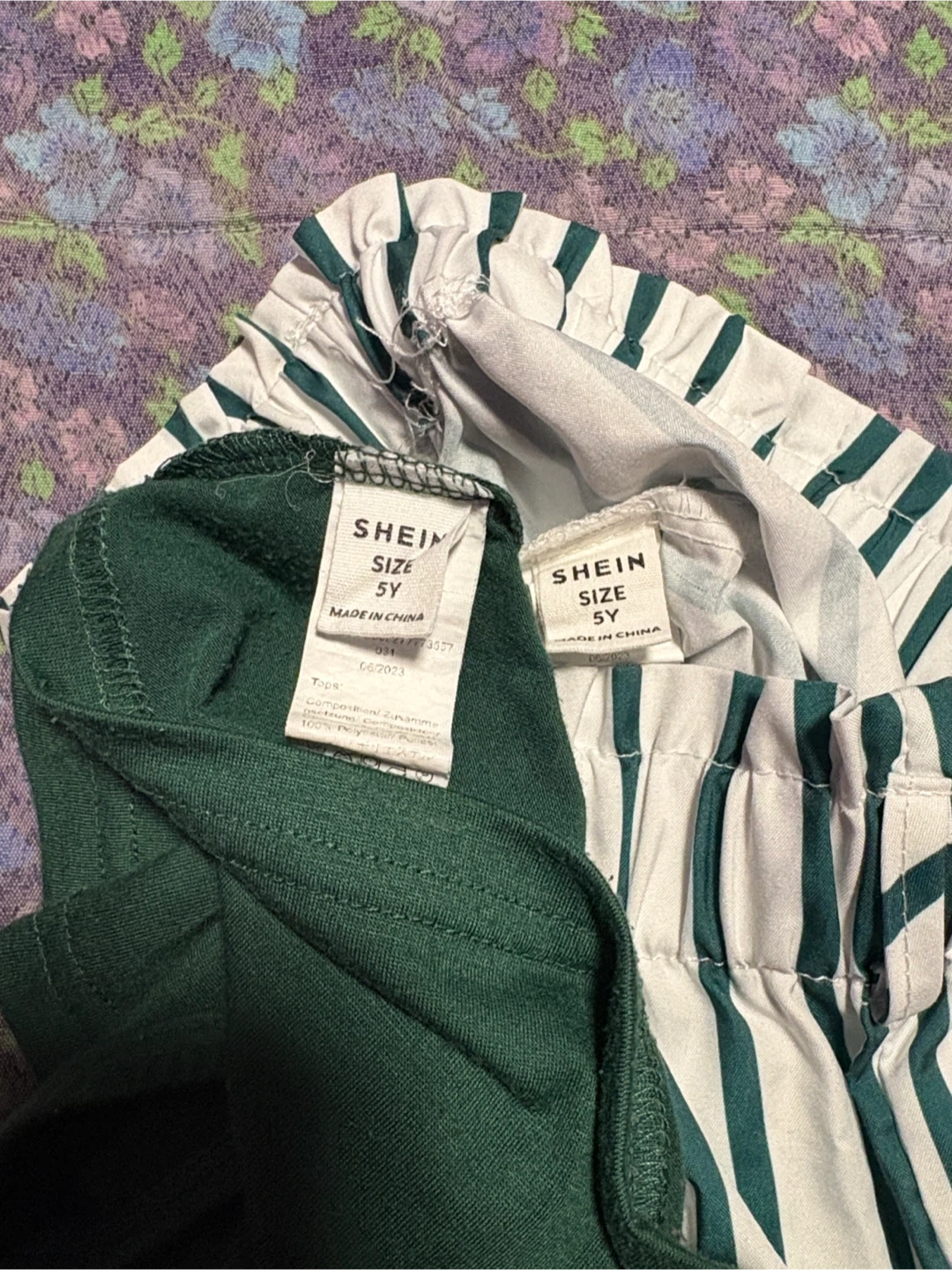 Cute little outfit from Shein for your kiddo! This set includes a dark green crop top and striped shorts, both in size 5Y. Perfect for summer days!