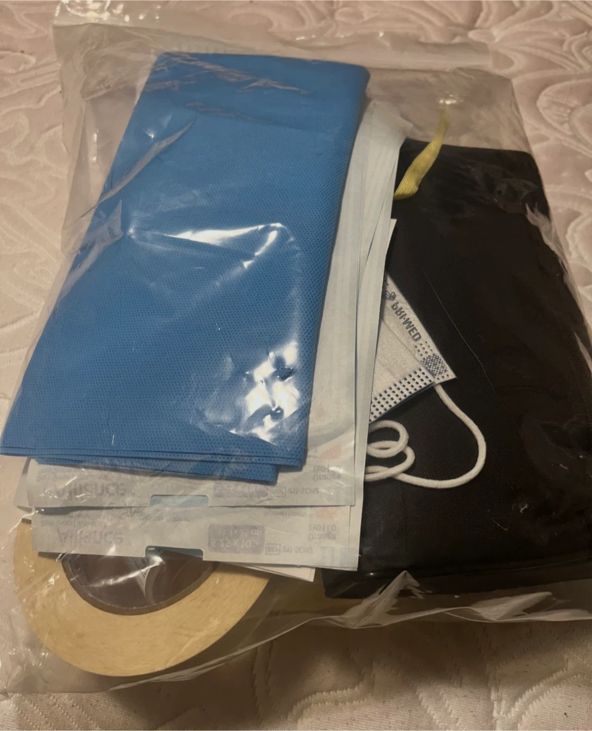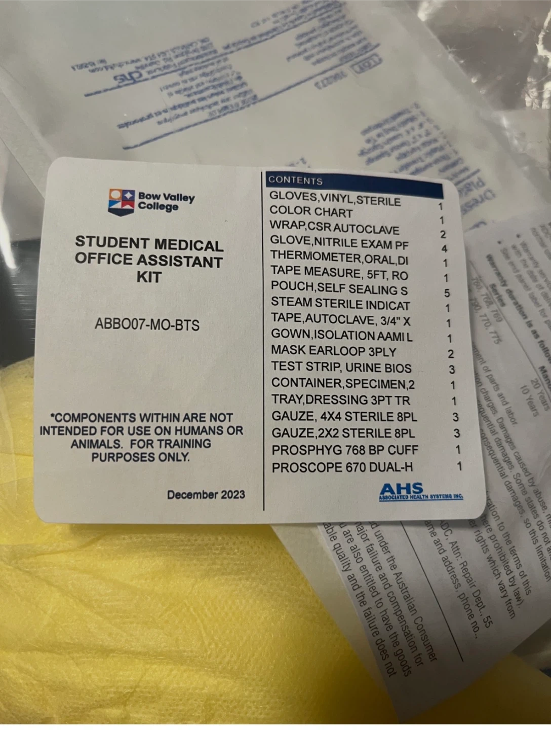 This is a student medical assistant kit by Bow Valley College. It includes various medical supplies like gloves, thermometers, and bandages. Items are packed for training purposes.