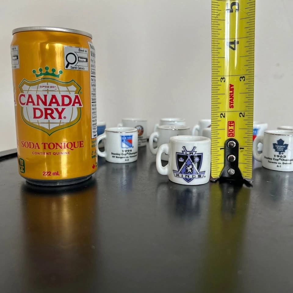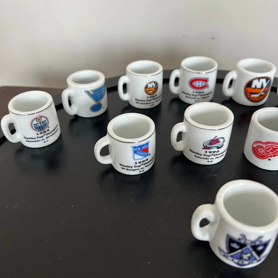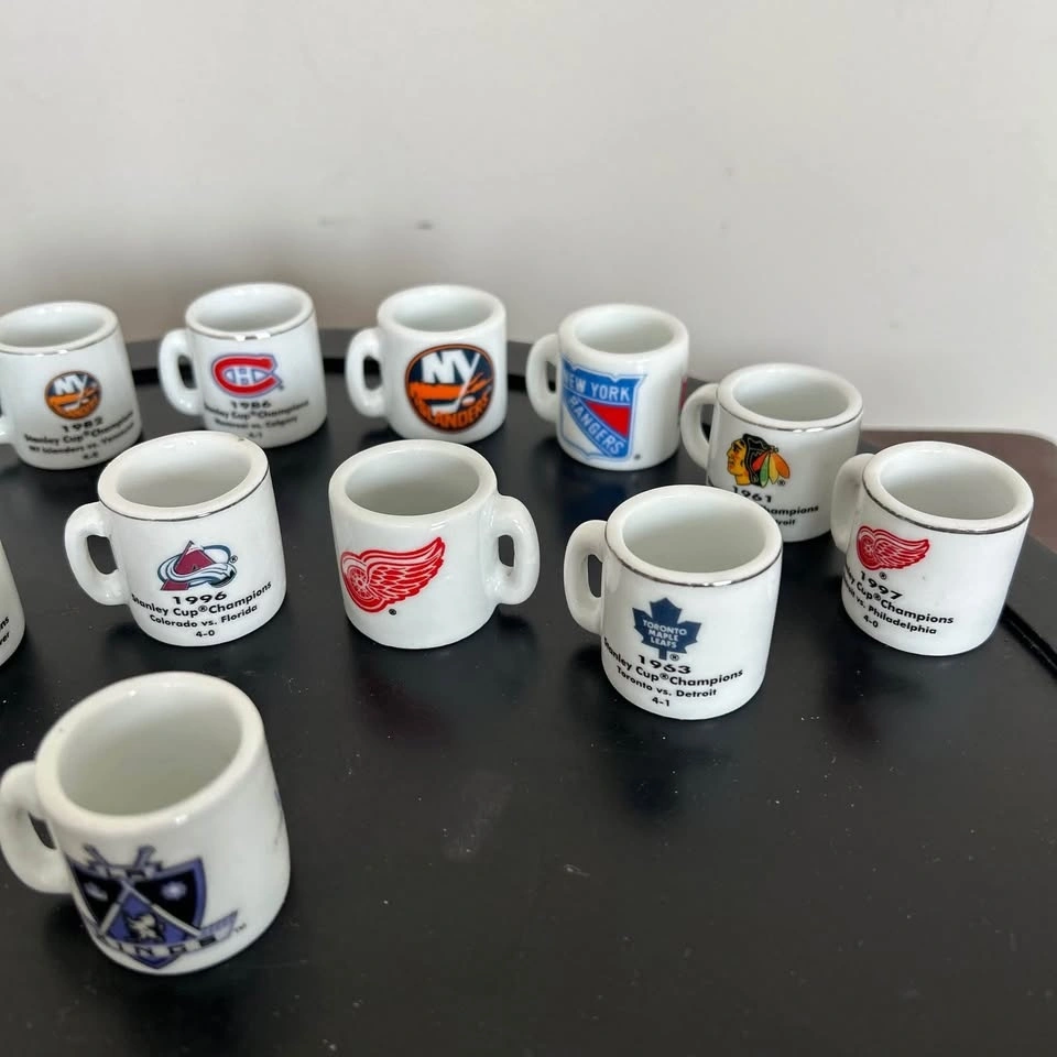Fun and collectible vintage NHL “Cup Crazy” Stanley Cup Champions mini mug collection featuring 13 miniature ceramic mugs celebrating historic championship wins. Each mug displays a team logo on one side and the Stanley Cup year, opponent, and series score on the other, making them a great nostalgic piece for hockey fans. These miniature mugs capture classic NHL history and are perfect for collectors, sports memorabilia enthusiasts, or as a unique display piece in a hockey-themed room, bar, or fan cave. Their small size and detailed graphics make them especially charming when displayed together as a full set. A great collectible lot celebrating the legacy of the Stanley Cup and some of hockey’s most memorable championship moments. Pick up in the Seton area, Calgary. Cash or e-transfer accepted. See my other listings! Feel free to message if you have any questions!