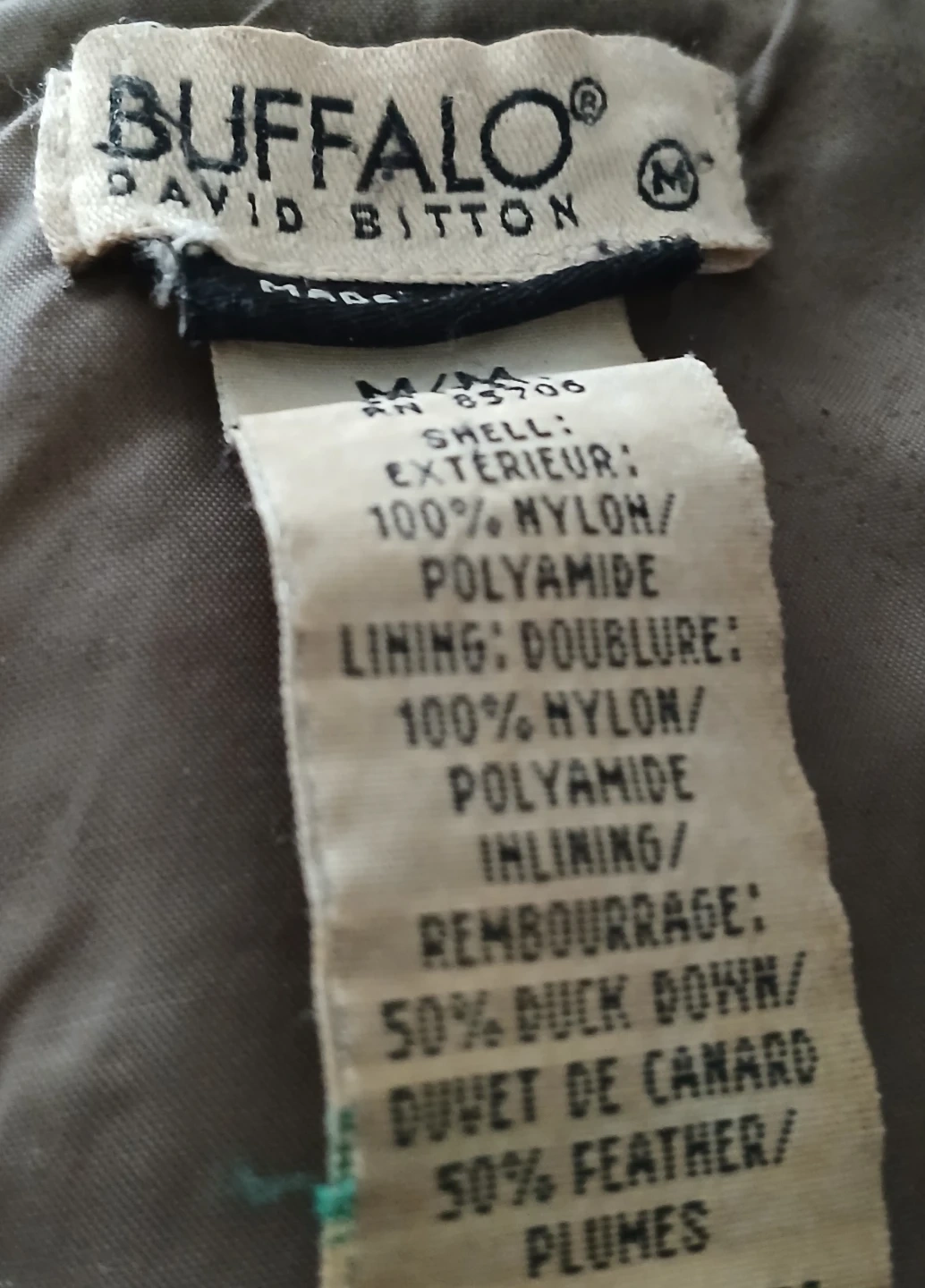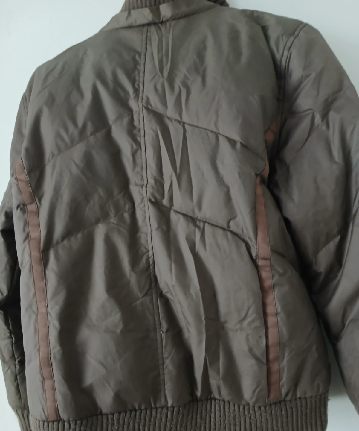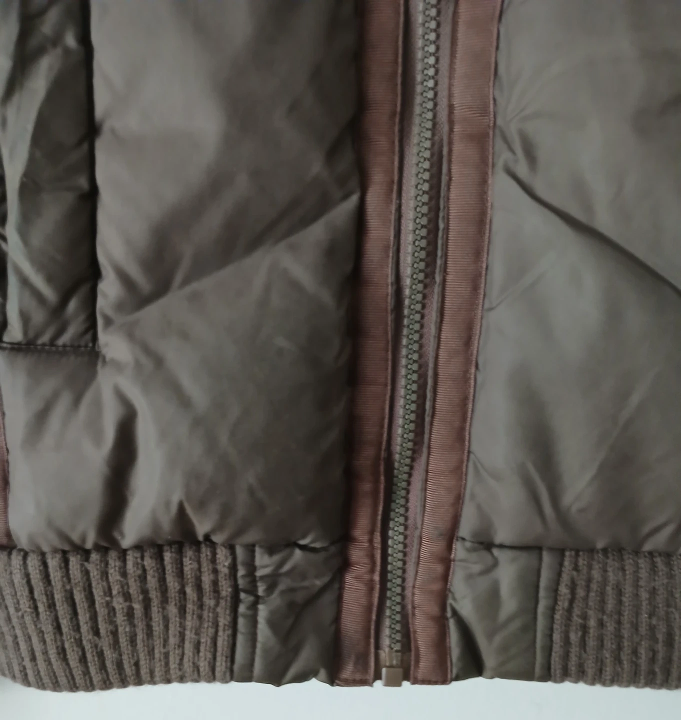 This Buffalo David Bitton puffer jacket is brown and size medium. It's made with a 100% nylon shell and lining, and filled with 50% duck down and 50% feather. Ribbed cuffs and collar provide a snug fit.