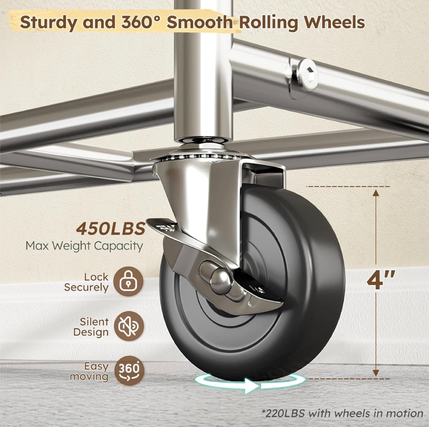 Raybee Heavy Duty Clothes Rack 75" Extra Wide, 450 LBS Clothing Rack with 4 Hooks, Lockable Wheels, Metal Garment Rack for Bedroom, Laundry Room, Commercial