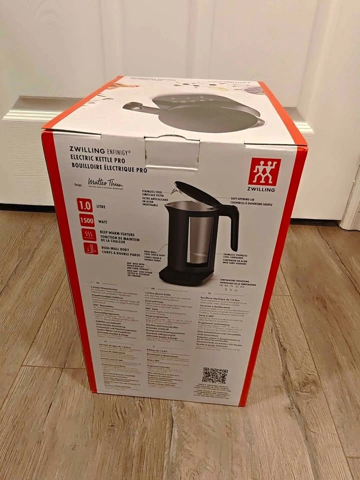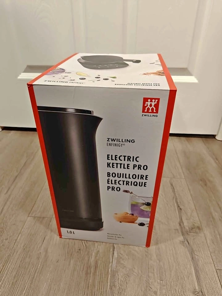 Brand new, never opened Zwilling Enfinigy Electric Kettle Pro in black. This 1.0 liter kettle is 1500 watts and features a keep warm function, dual-wall body, stainless steel interior, and temperature presets. Perfect for all your hot beverage needs! Pickup is available near Highway 7 East and Kennedy Road in Richmond Hill, close to the Saigon Star restaurant plaza.