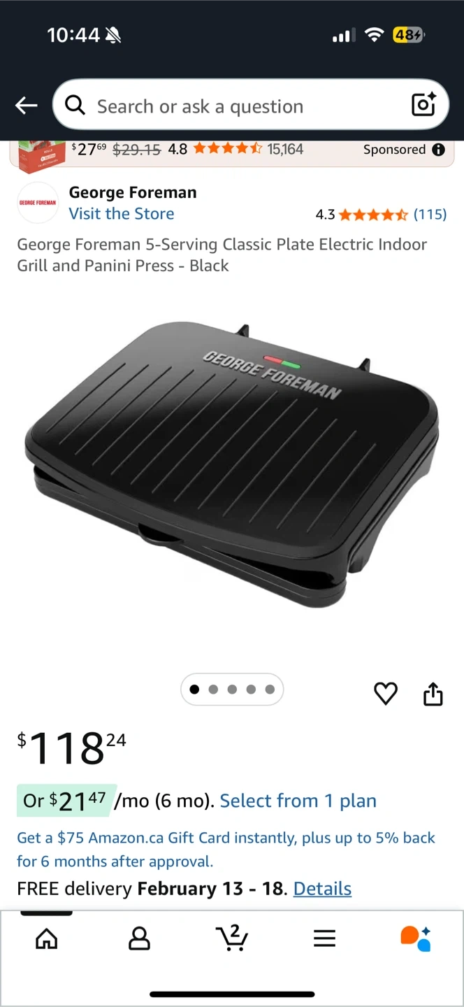 This George Foreman grill and panini press serves 5. It features George Tough nonstick coating for easy cleanup. The removable drip tray is dishwasher safe. It's great for healthy grilling and fast, even cooking!