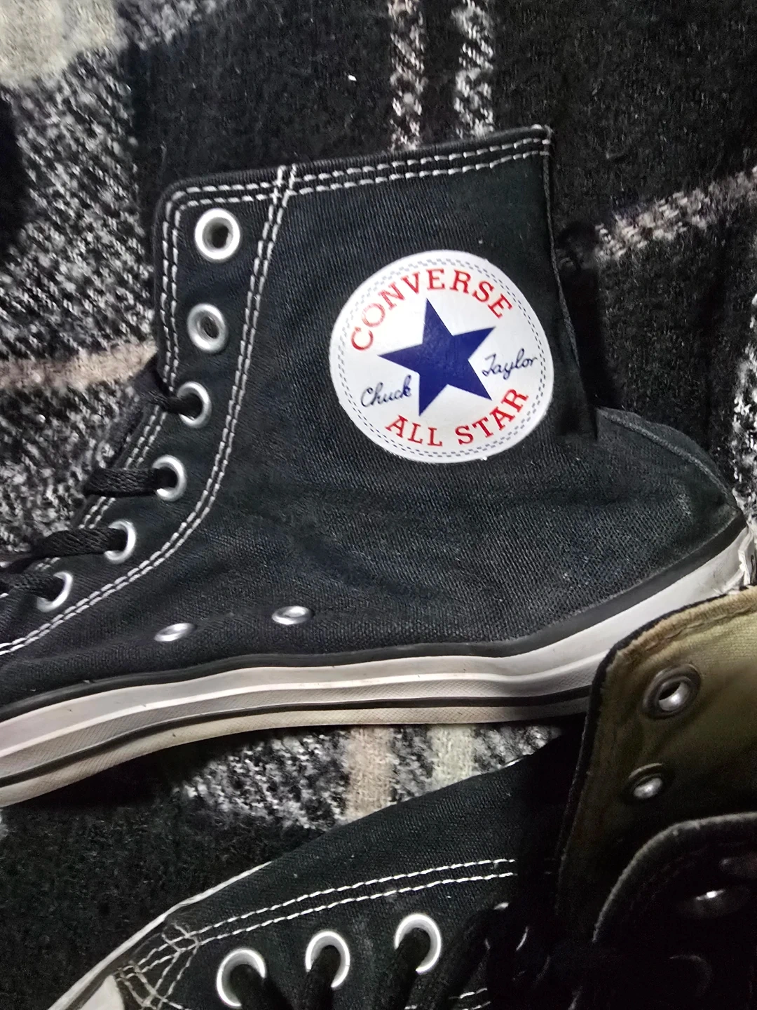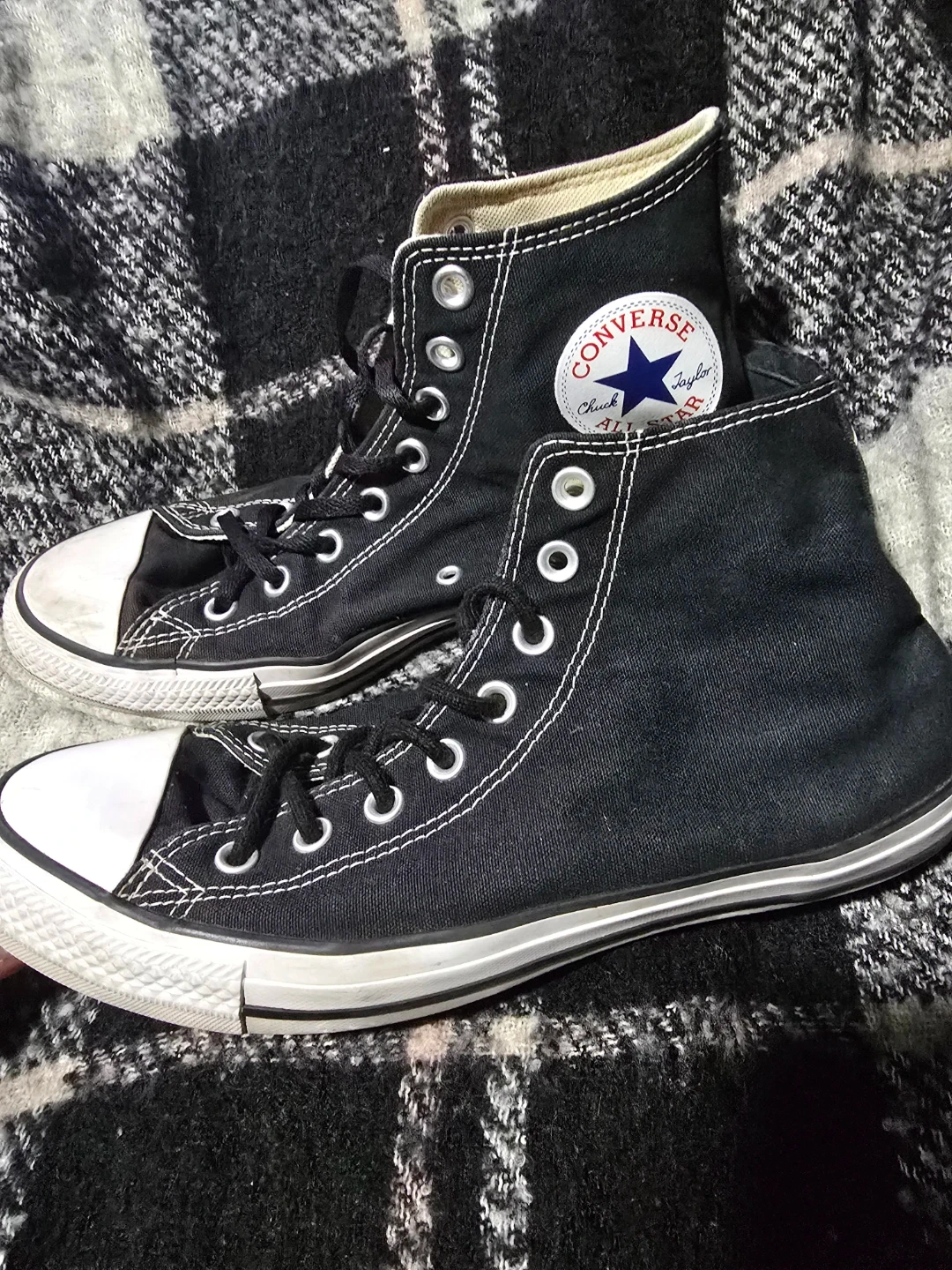 Black Converse Chuck Taylor All Star high top sneakers. Classic canvas upper with the iconic Chuck Taylor logo patch. Rubber toe cap and sole. Size 11
