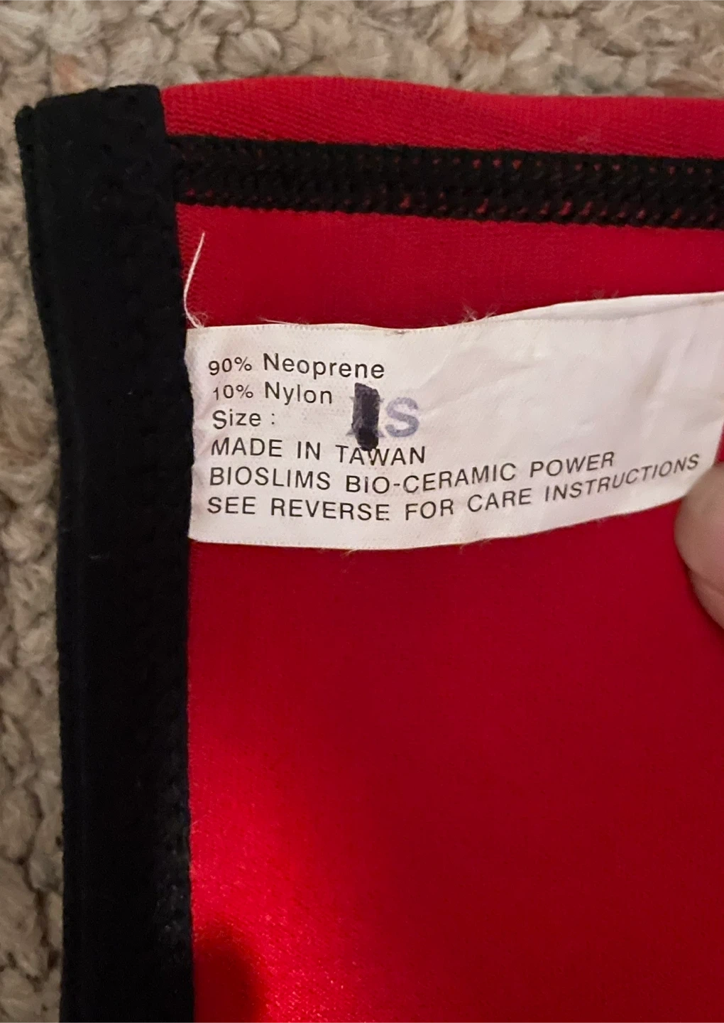 Red shorts made with 90% neoprene and 10% nylon. Size is S. Made in Taiwan. Features Bio-Slms Bio-Ceramic Power. These are great for activities that require movement and support.