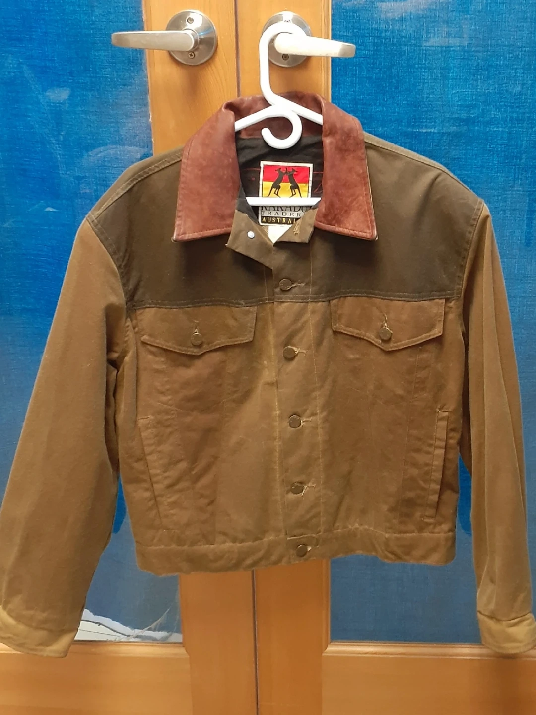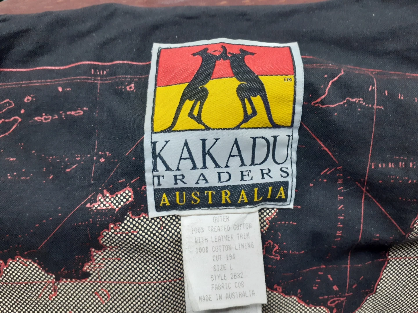 This Kakadu Traders jacket is made with 100% treated cotton outer and 100% cotton lining. It features leather trim on the collar and has two chest pockets. The jacket is size L and was made in Australia. Like new.