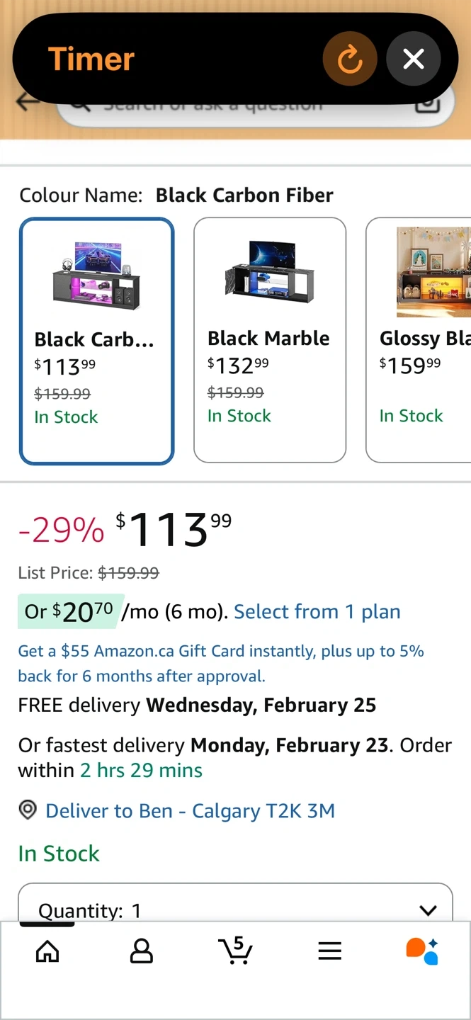 This Bestier entertainment center features open storage shelves and an adjustable glass shelf. It's made with a black carbon fiber finish. Dimensions are 57" W x 13.8" D x 20.7" H.