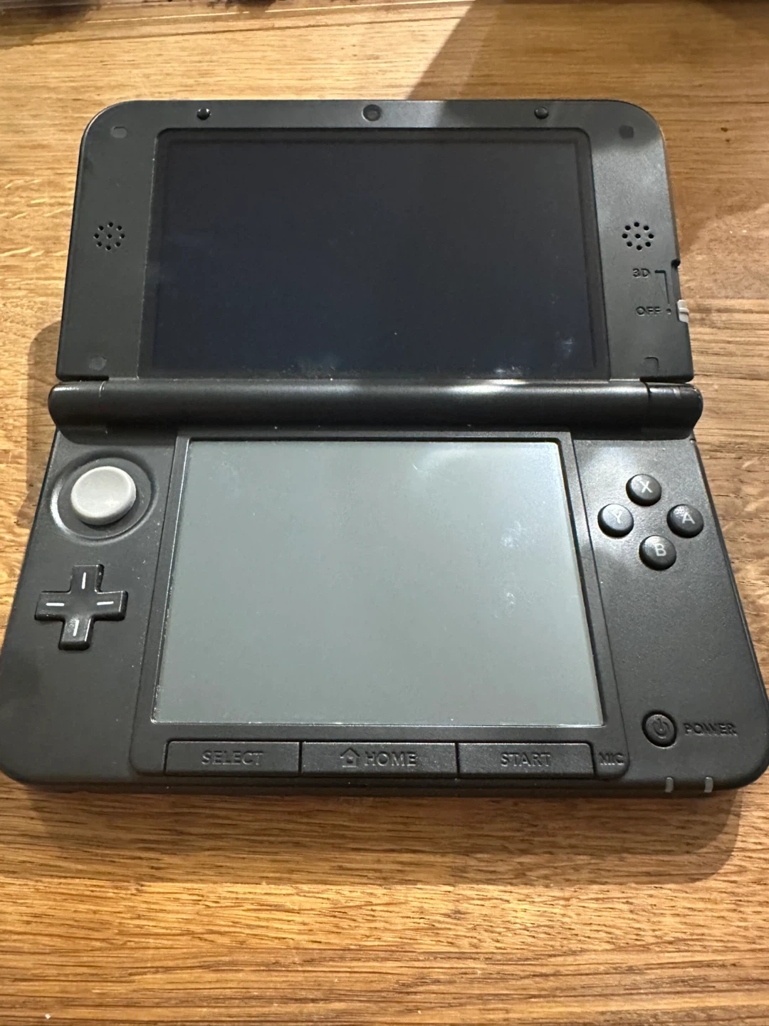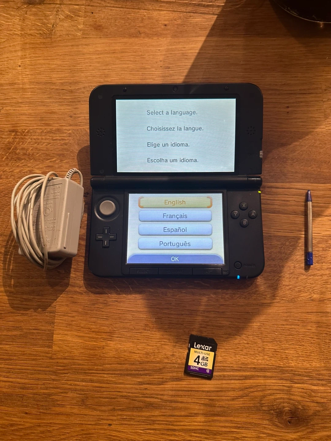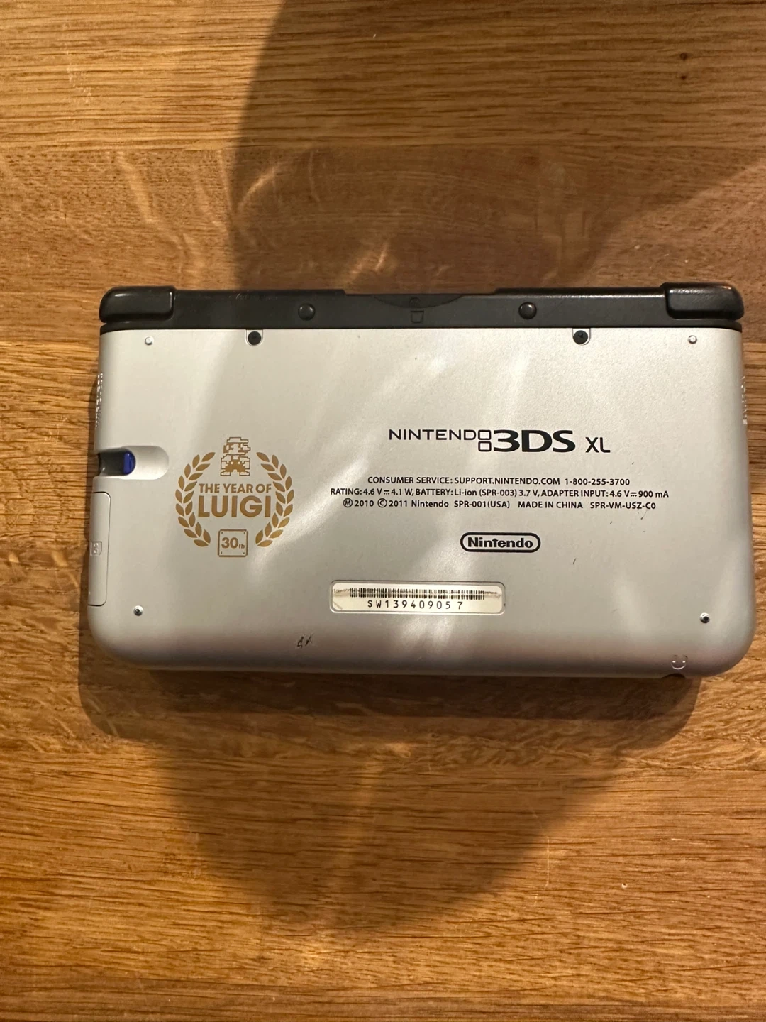 Nintendo 3DS XL console in silver with Luigi 30th anniversary design. It's in good condition and comes with a charger and a 4GB SD card.
