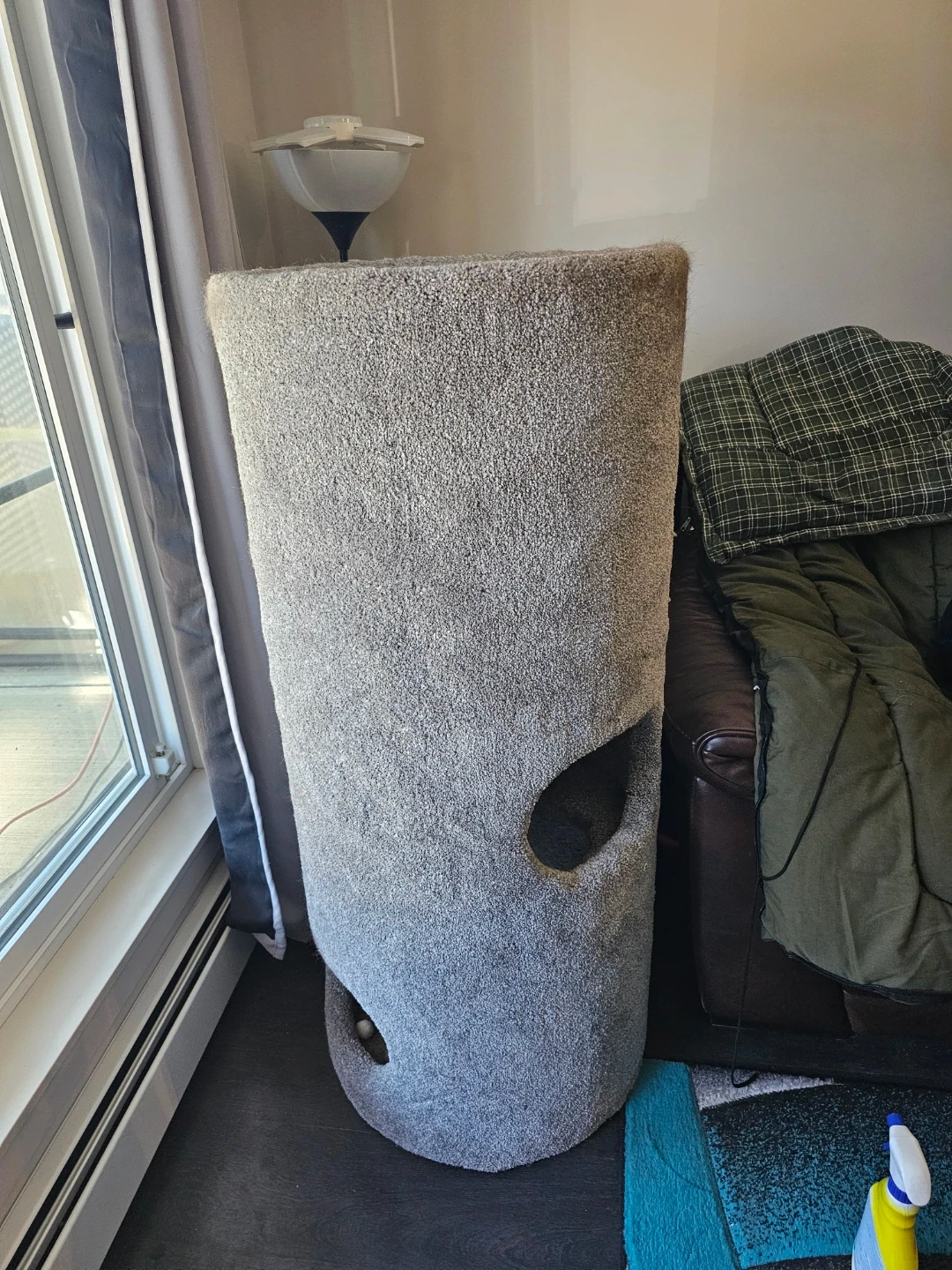 This is a carpeted cat condo with multiple openings for your feline friend to explore. It's made of durable carpet material, providing a scratching surface. Cats often enjoy hiding and resting inside such structures.
