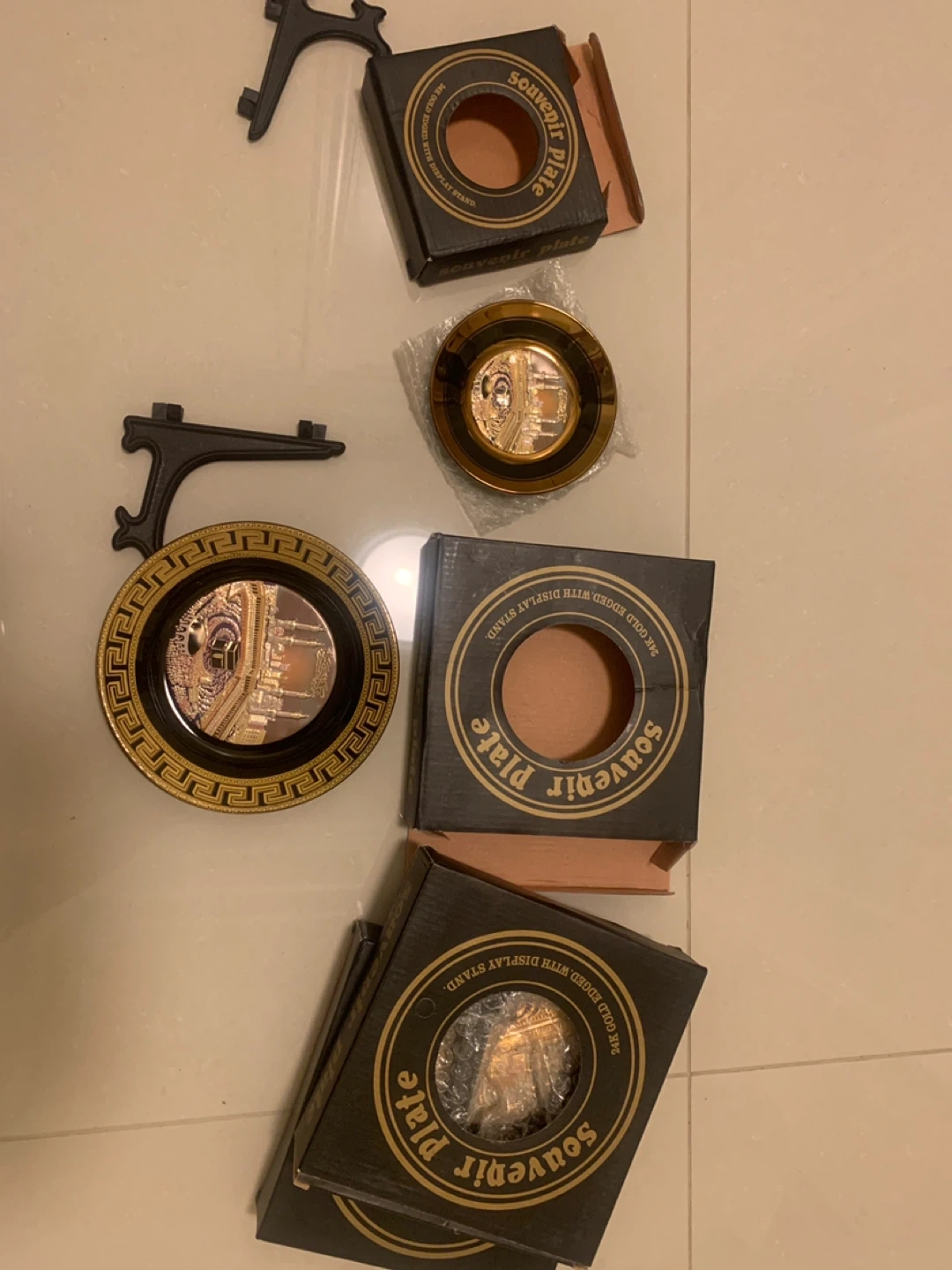 Includes souvenir plates with a 24K gold edge. Each plate comes with a display stand. They are individually packaged. Has been bought in maka. 3 big and one small. Price for all.
