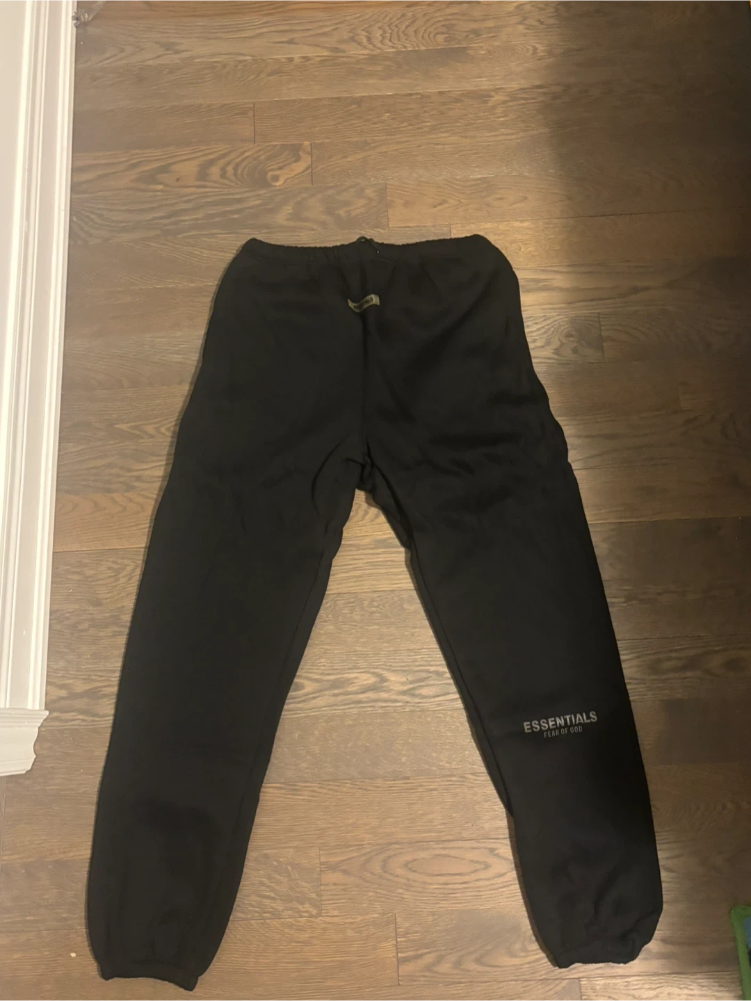 Selling a pair of black sweatpants from Essentials Fear of God. These are in great condition and super comfy for lounging around or running errands. The material is soft and durable, perfect for everyday wear!