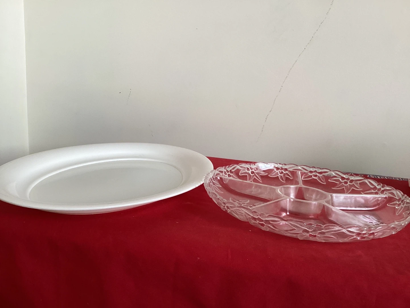 Two serving platters available: one white and one clear plastic The clear plastic platter has a floral design and divided sections, perfect for serving snacks or appetizers. The white platter is a simple, classic design. Plastic on is brand new