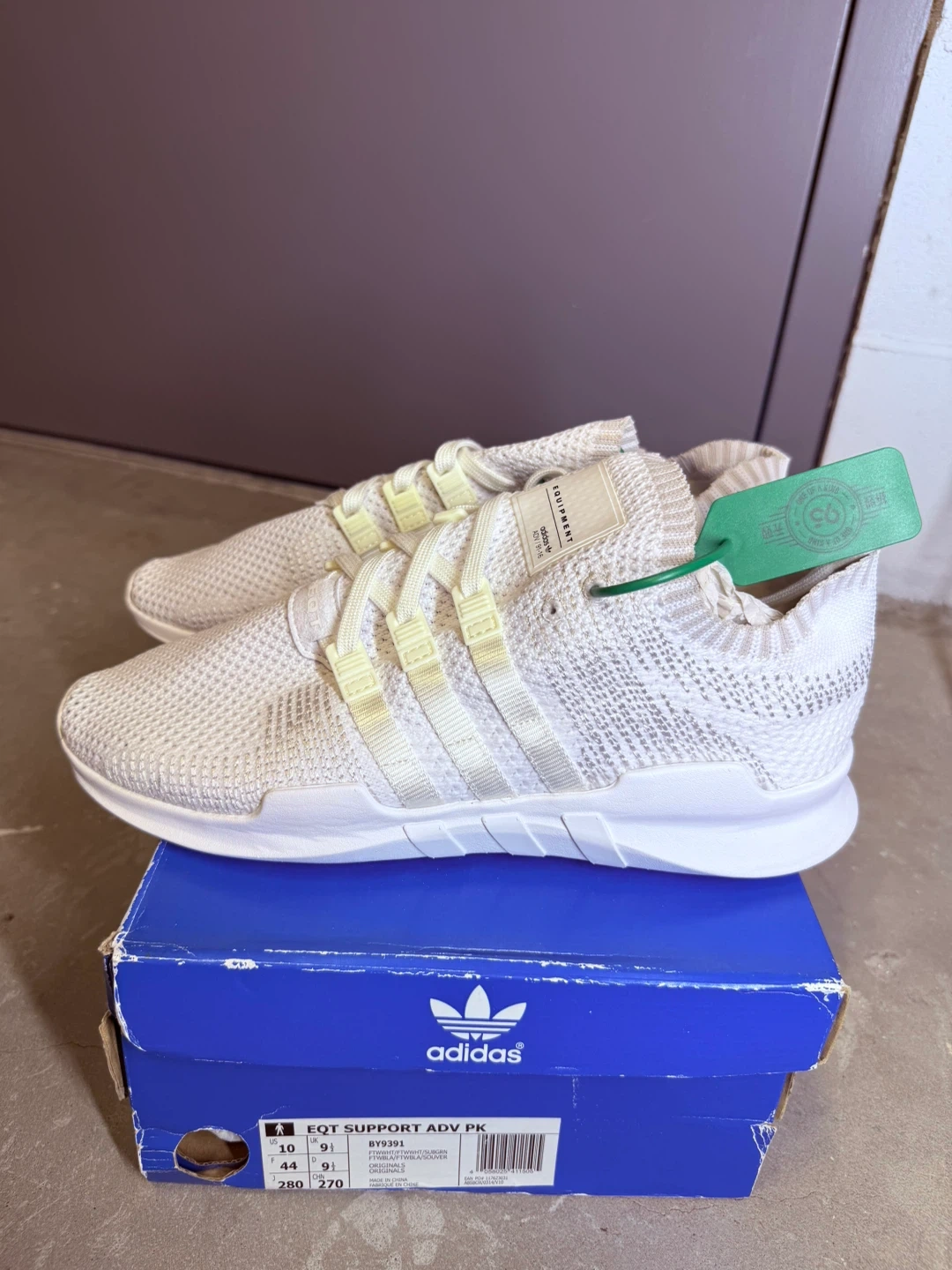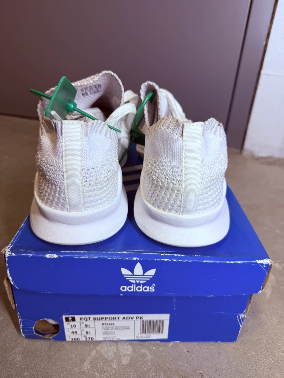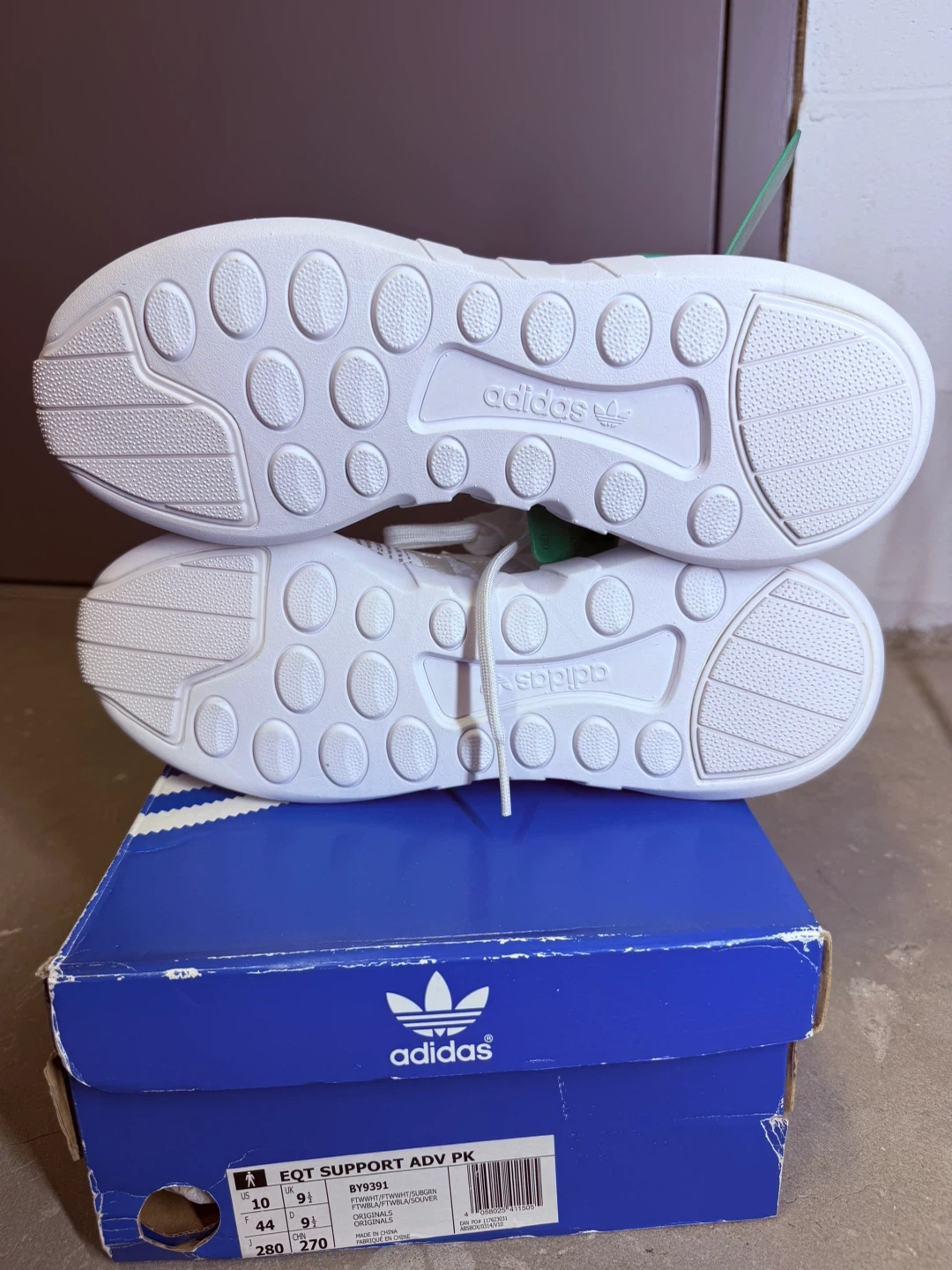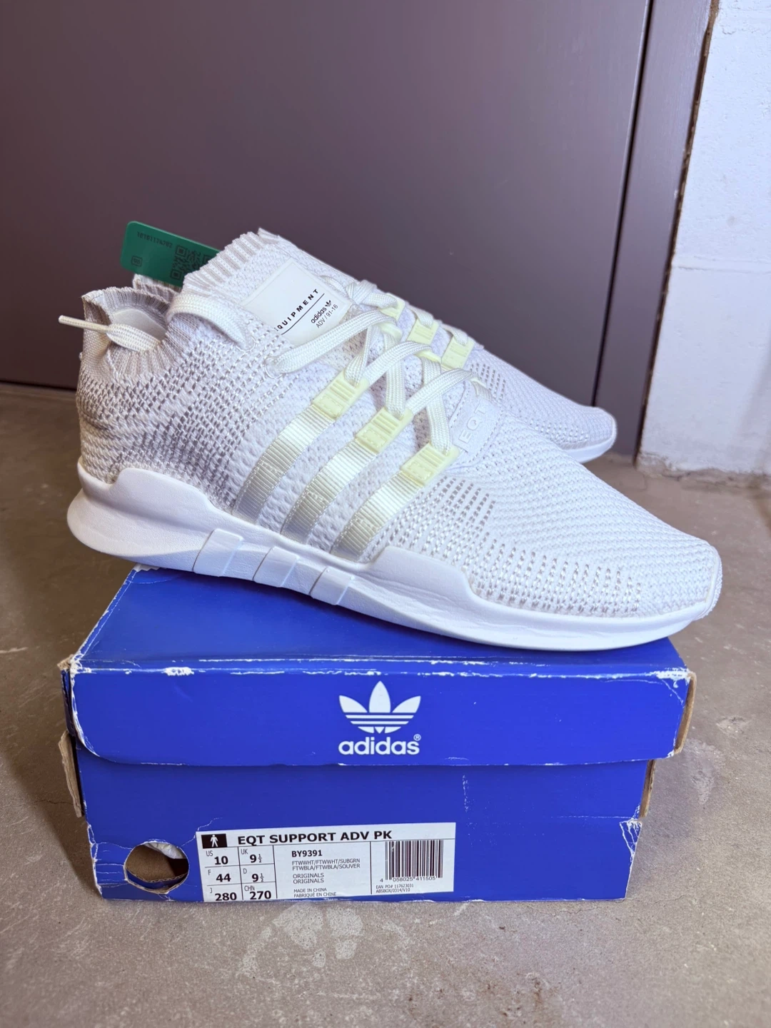 Adidas EQT Support ADV PK sneakers in white, size 10. These shoes feature a knit upper and rubber sole. Original box included. NEW, roomy.