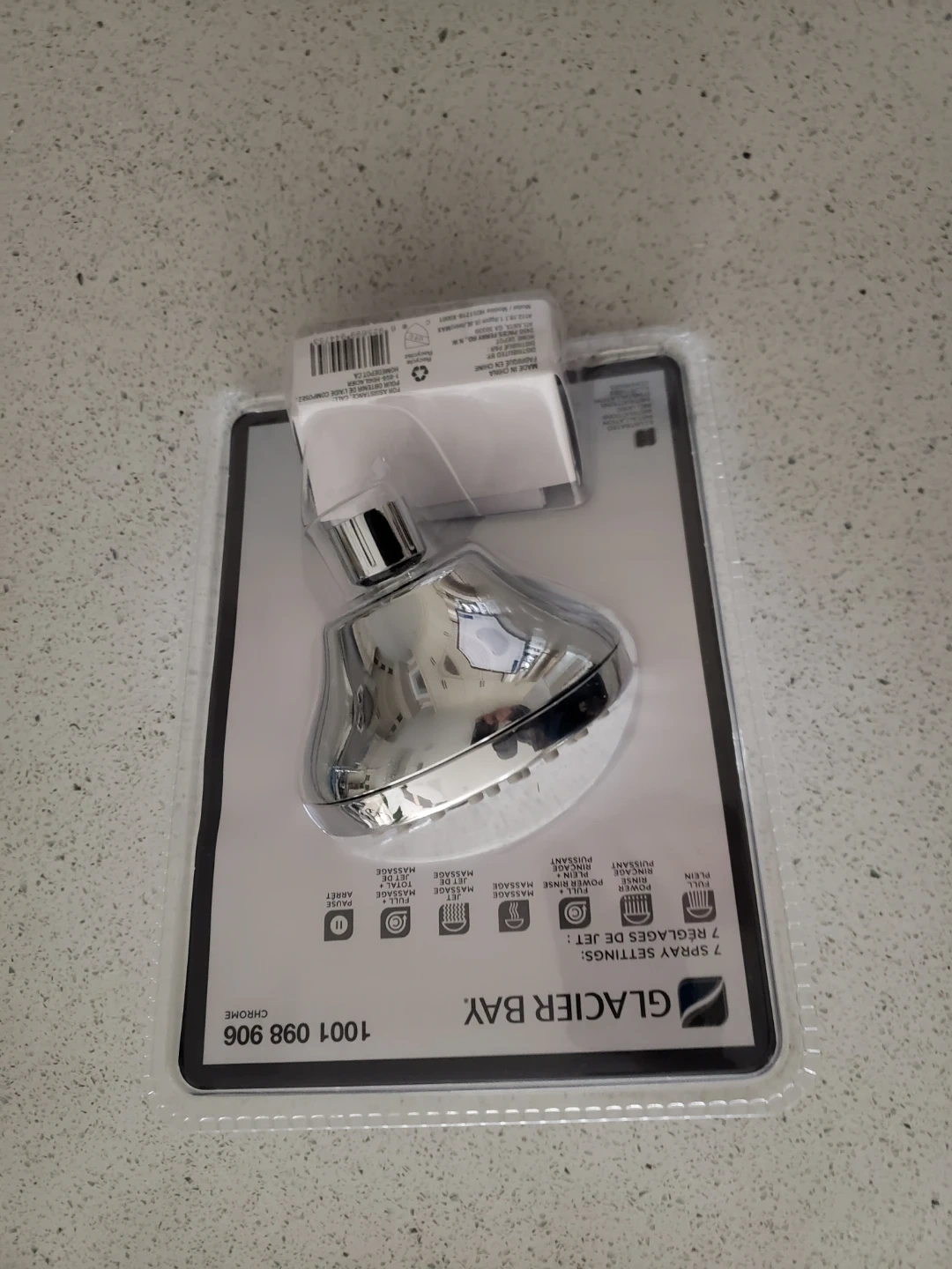Glacier Bay Lavmere fixed round showerhead in chrome. It's a new item in its original packaging and features 7 spray settings. This showerhead is ideal for upgrading your bathroom experience.