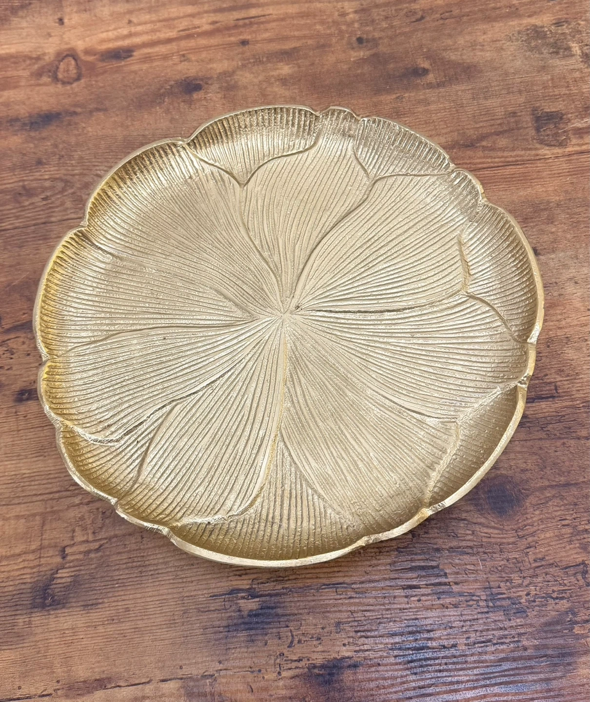 A decorative cake stand with a gold leaf design. It's made of metal with a fluted base. Perfect for displaying desserts or serving snacks!