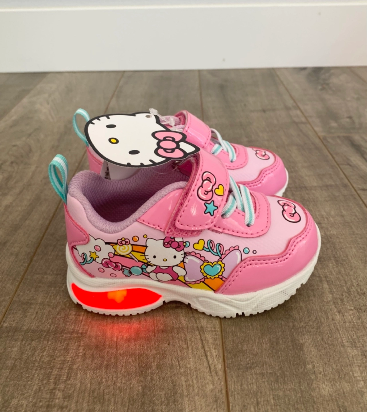 Adorable pink Hello Kitty sneakers for kids. Features flashing lights in the soles and a secure velcro strap closure. These fun shoes are perfect for little ones who love Hello Kitty!