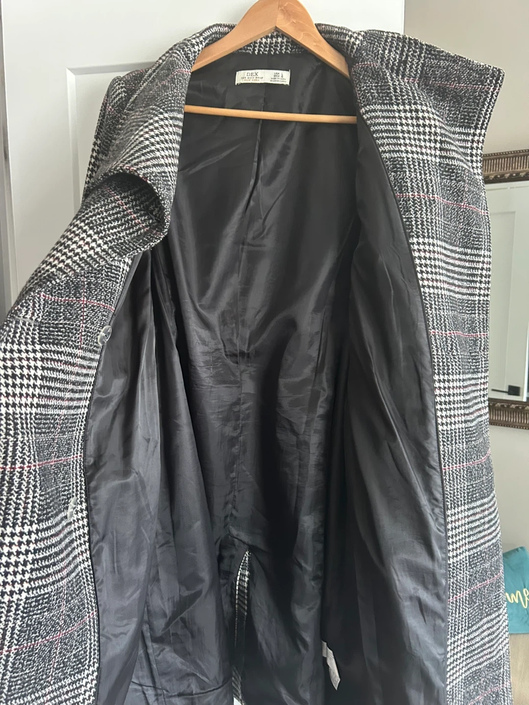 This DEX The Suit Shop coat features a classic plaid pattern with a belt for a cinched waist. It's fully lined and made for warmth. Great for cooler weather! Excellent condition wore a few times. No damage no missing buttons or rips.